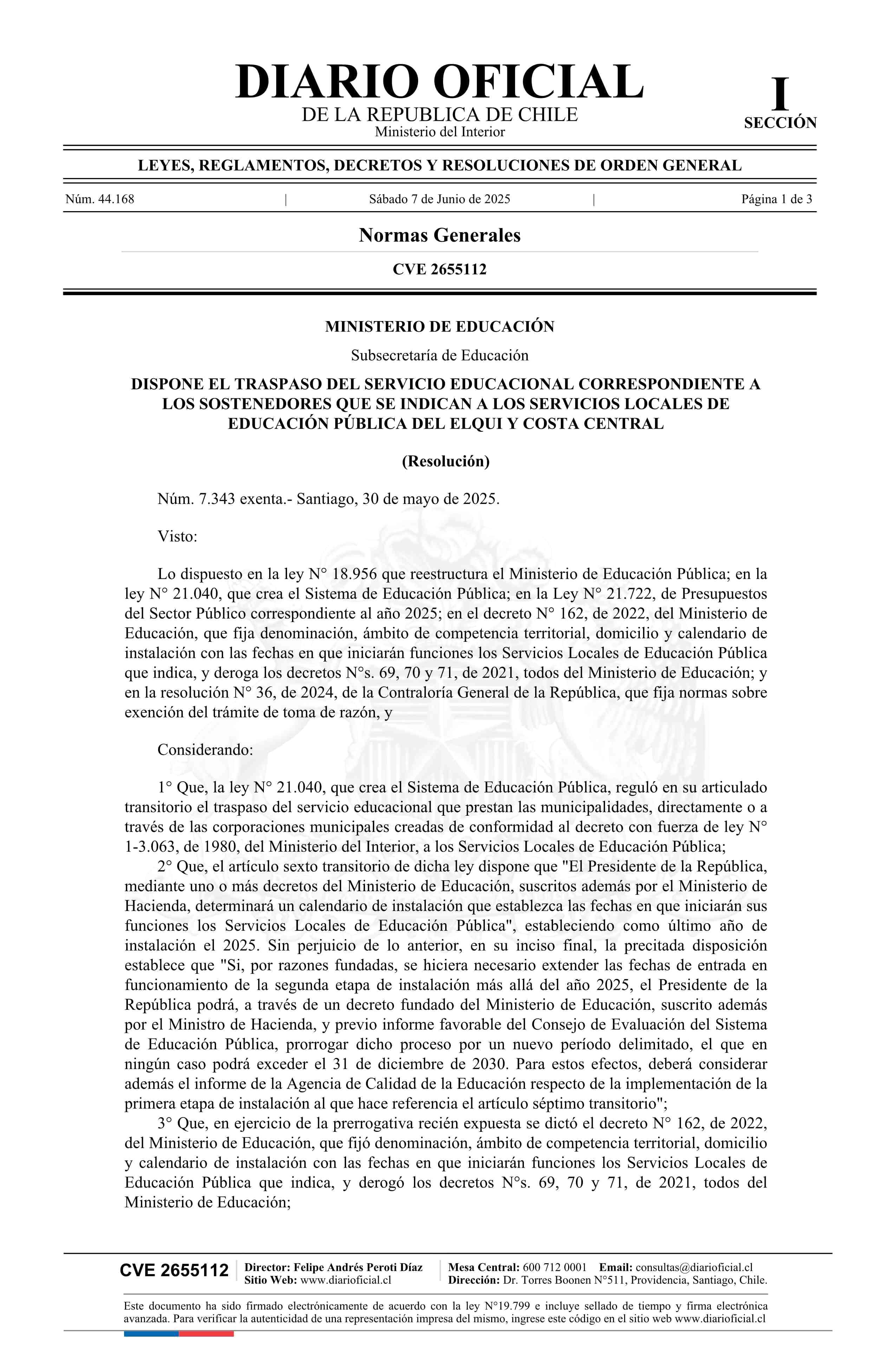 Título: Resolución exenta número 7.343, de 2025.- Dispone el traspaso del servicio educacional correspondiente a los sostenedores que se indican a los Servicios Locales de Educación Pública del Elqui y Costa Central