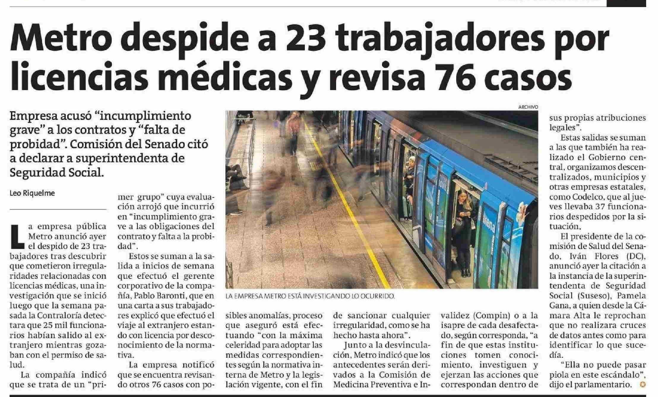 | Título: | Metro despide a 23 trabajadores por licencias médicas y revisa 76 casos |