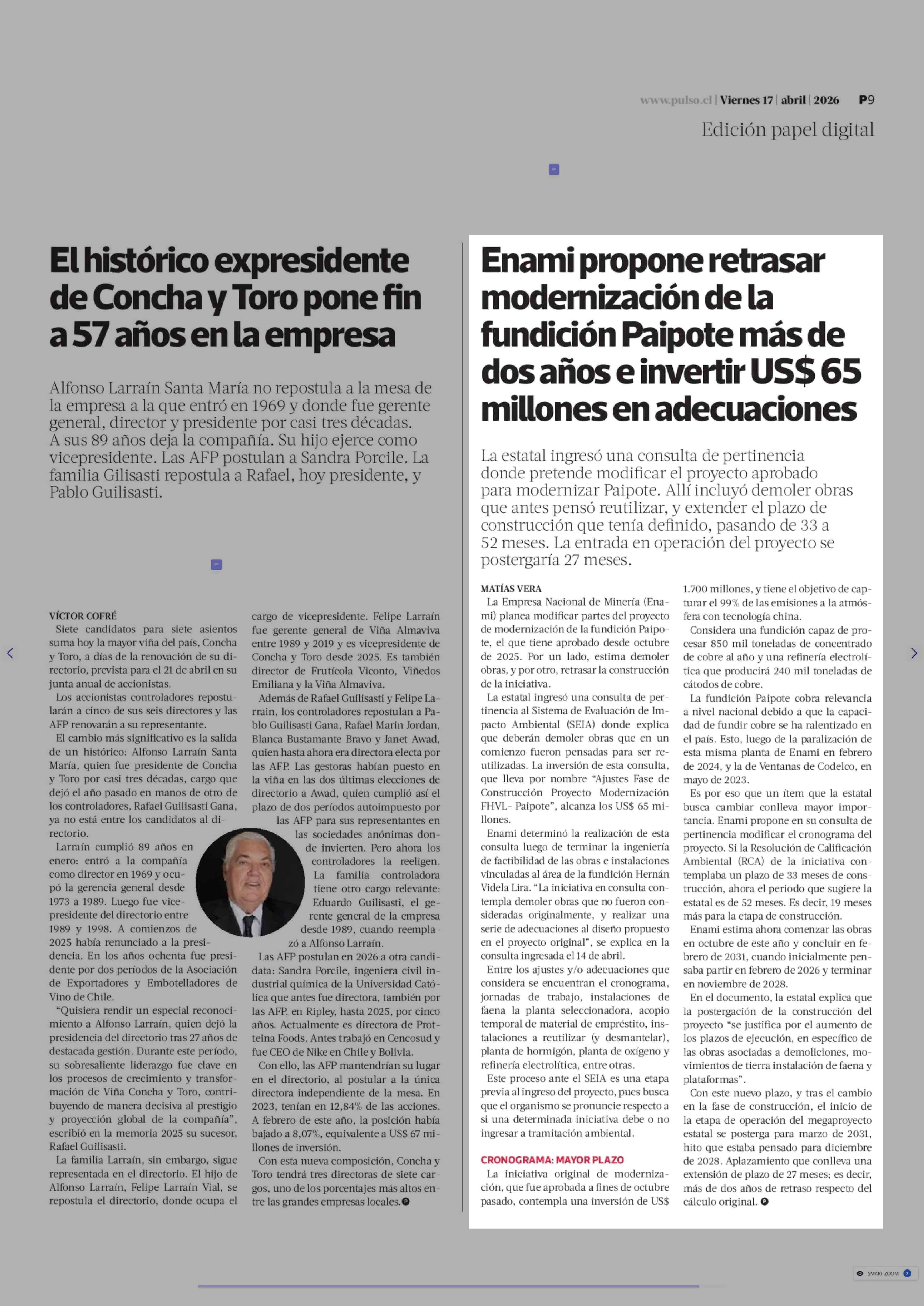 Enami propone retrasar modernización de la fundición Paipote más de dos años e invertir US$ 65 millones en adecuaciones 17-04-2026 La Tercera |