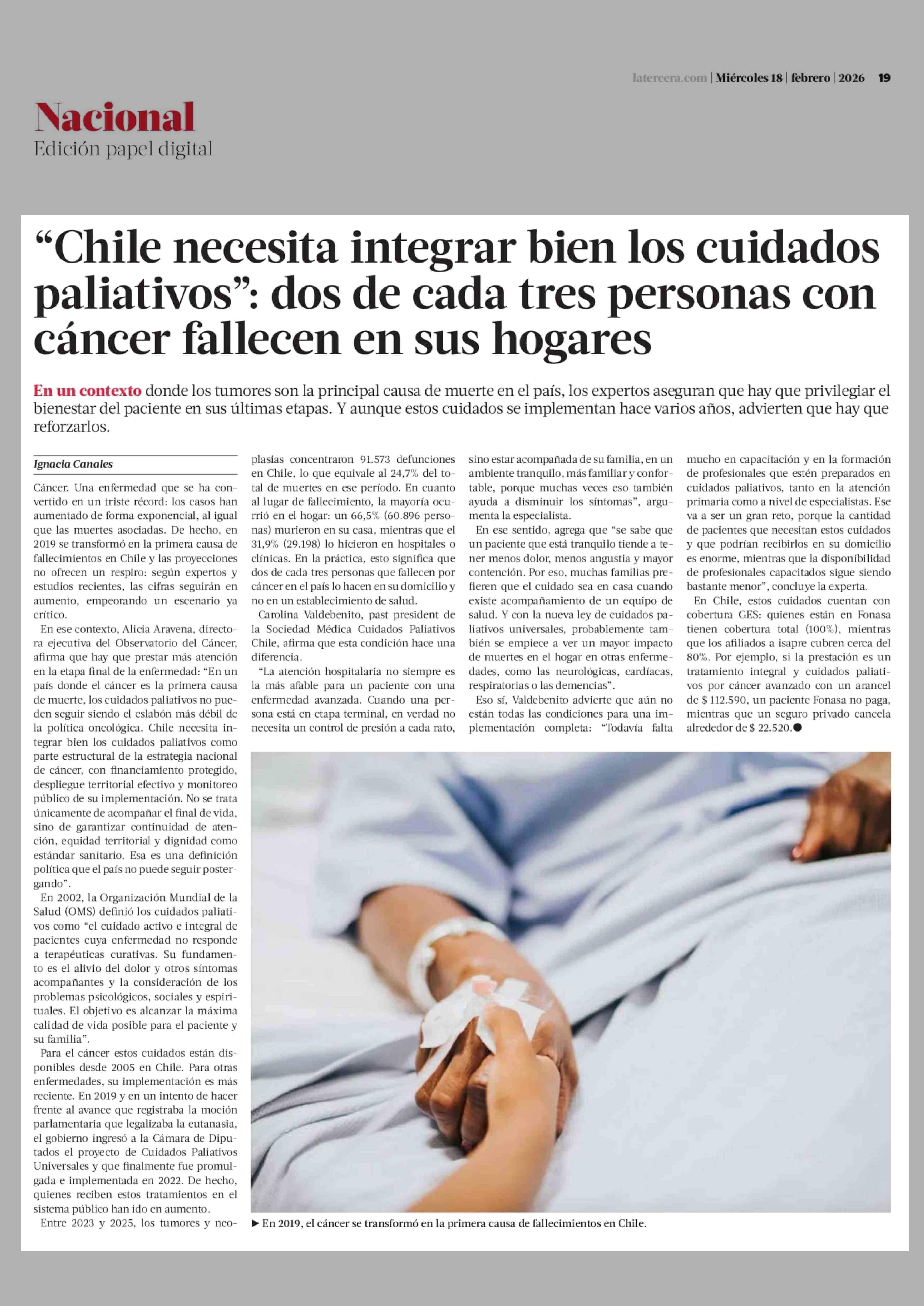 "Chile necesita integrar bien los cuidados paliativos": dos de cada tres personas con cáncer fallecen en sus hogares 18-02-2026 La Tercera |