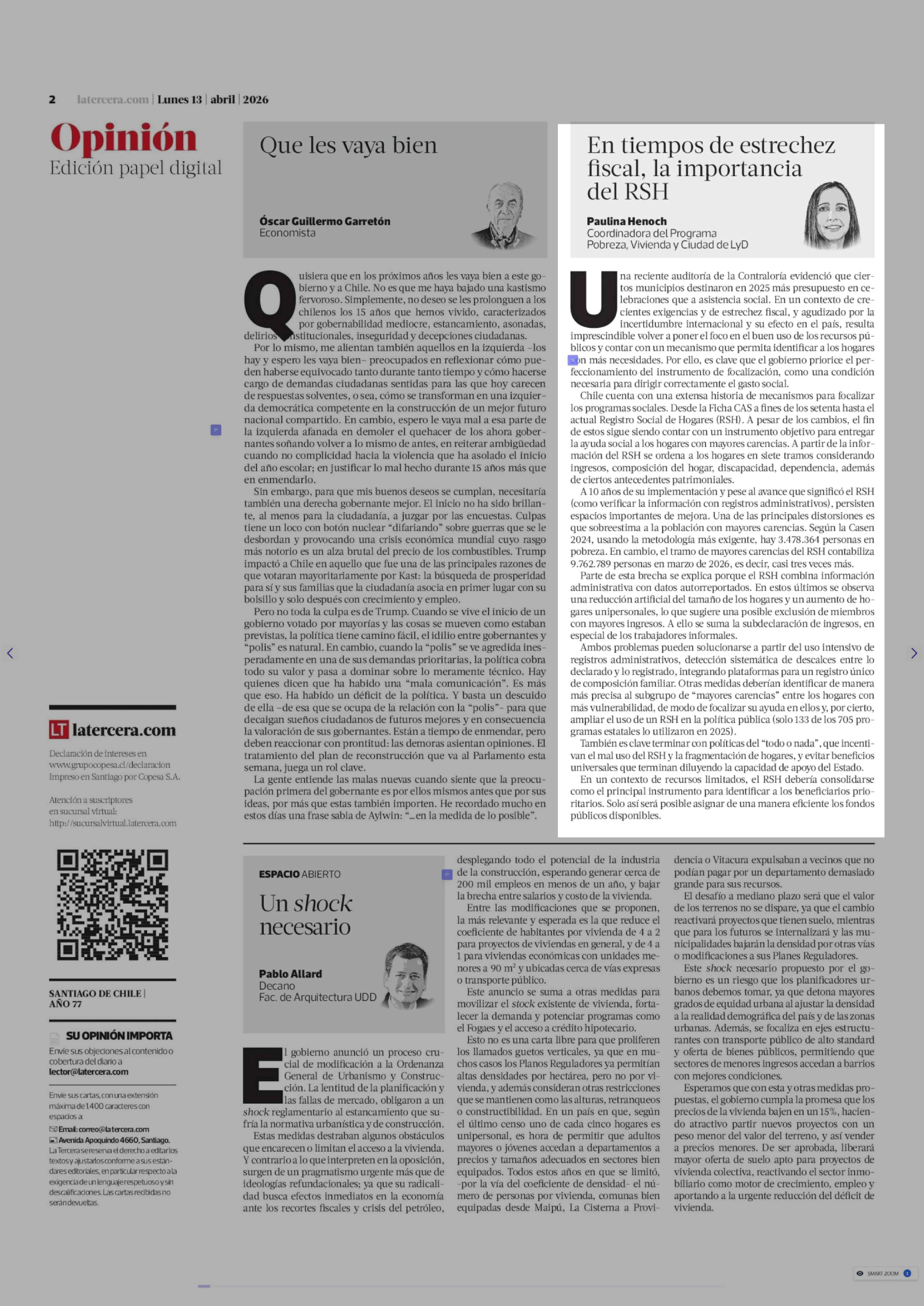 Columnas de Opinión: En tiempos de estrechez fiscal, la importancia del RSH 13-04-2026 La Tercera |