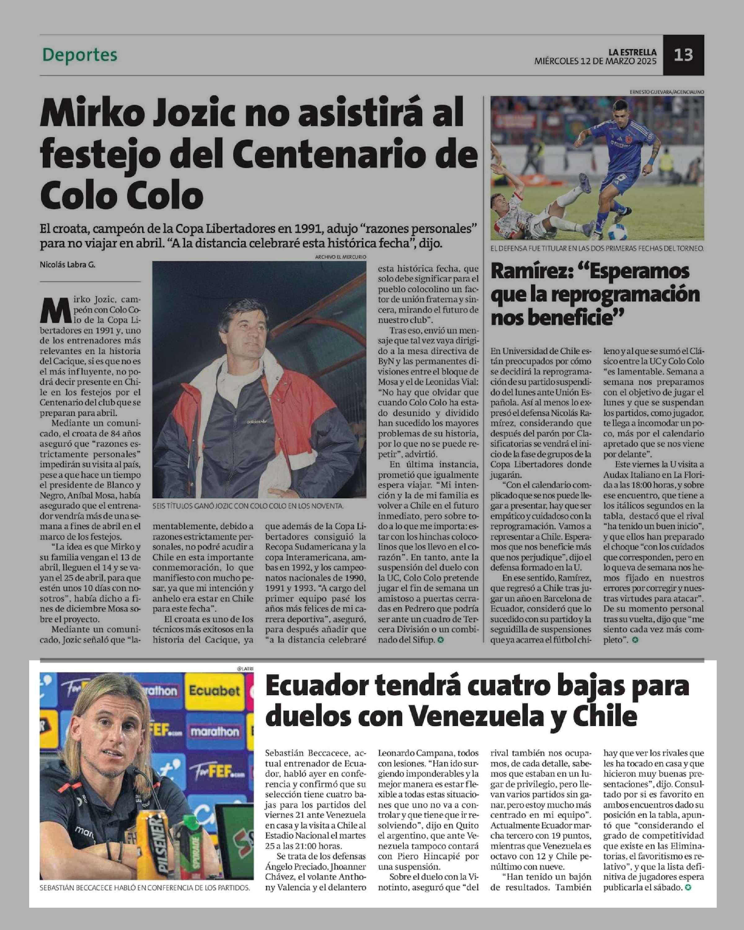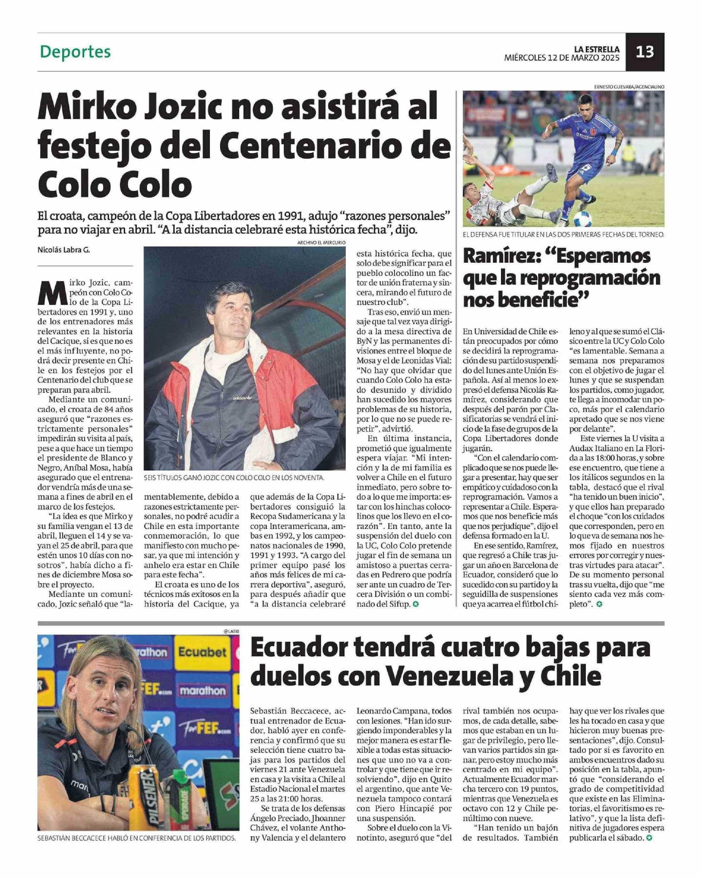 Ecuador tendrá cuatro bajas para duelos con Venezuela y Chile 12-03-2025 La Estrella de Tocopilla |
