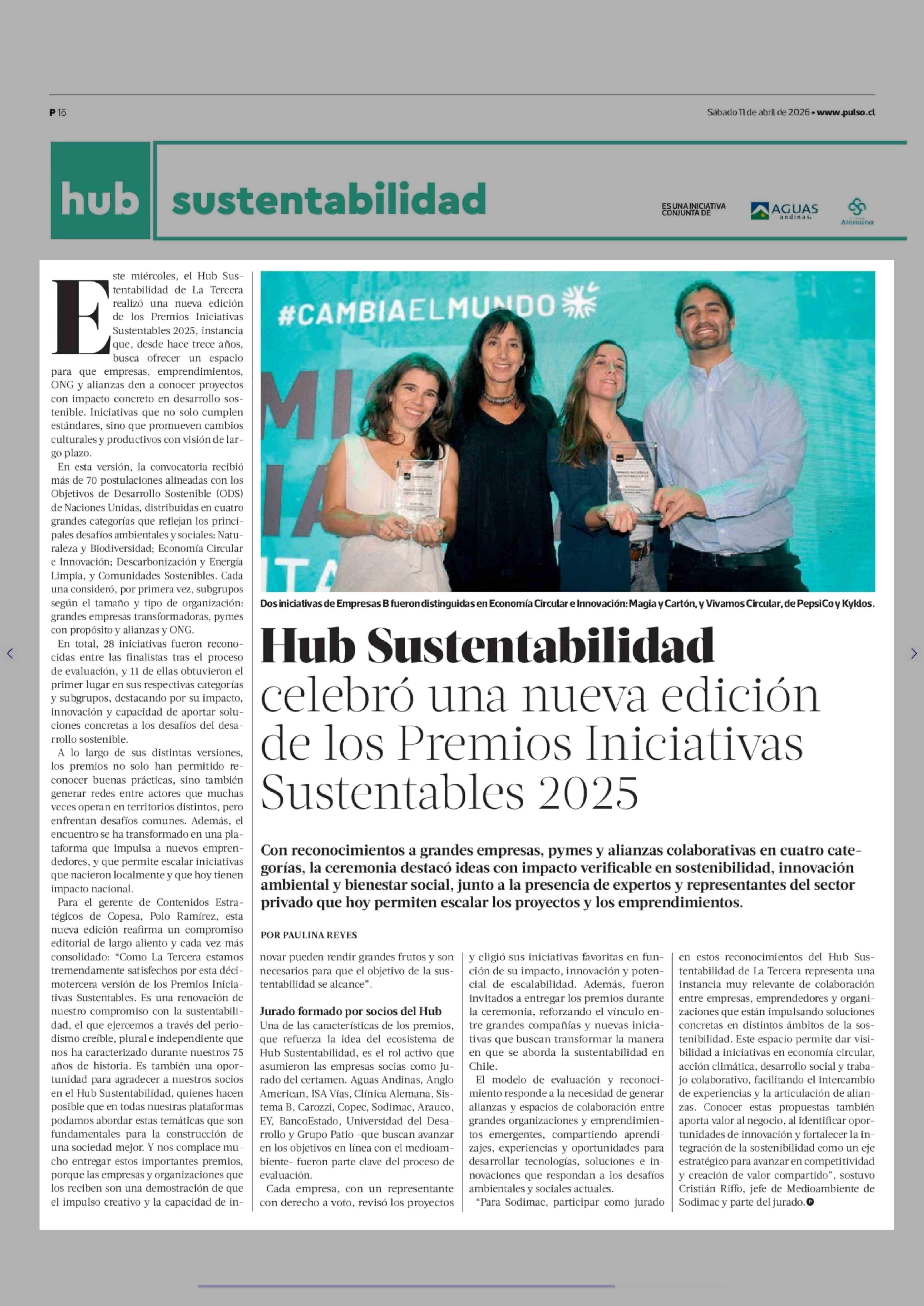 Hub Sustentabilidad celebró una nueva edición de los Premios Iniciativas Sustentables 2025 11-04-2026 La Tercera |