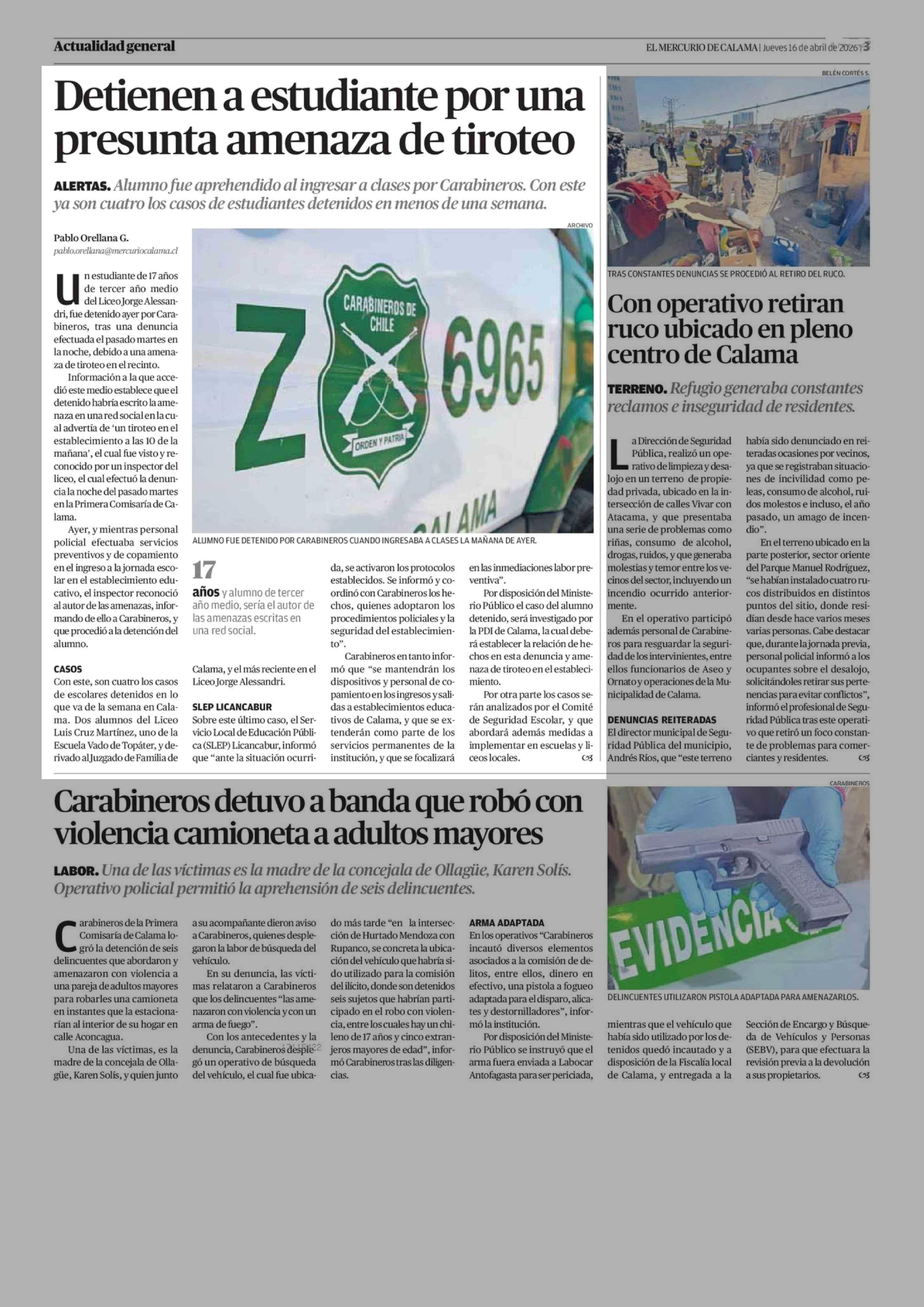Detienen a estudiante por una presunta amenaza de tiroteo 16-04-2026 El Mercurio de Calama |