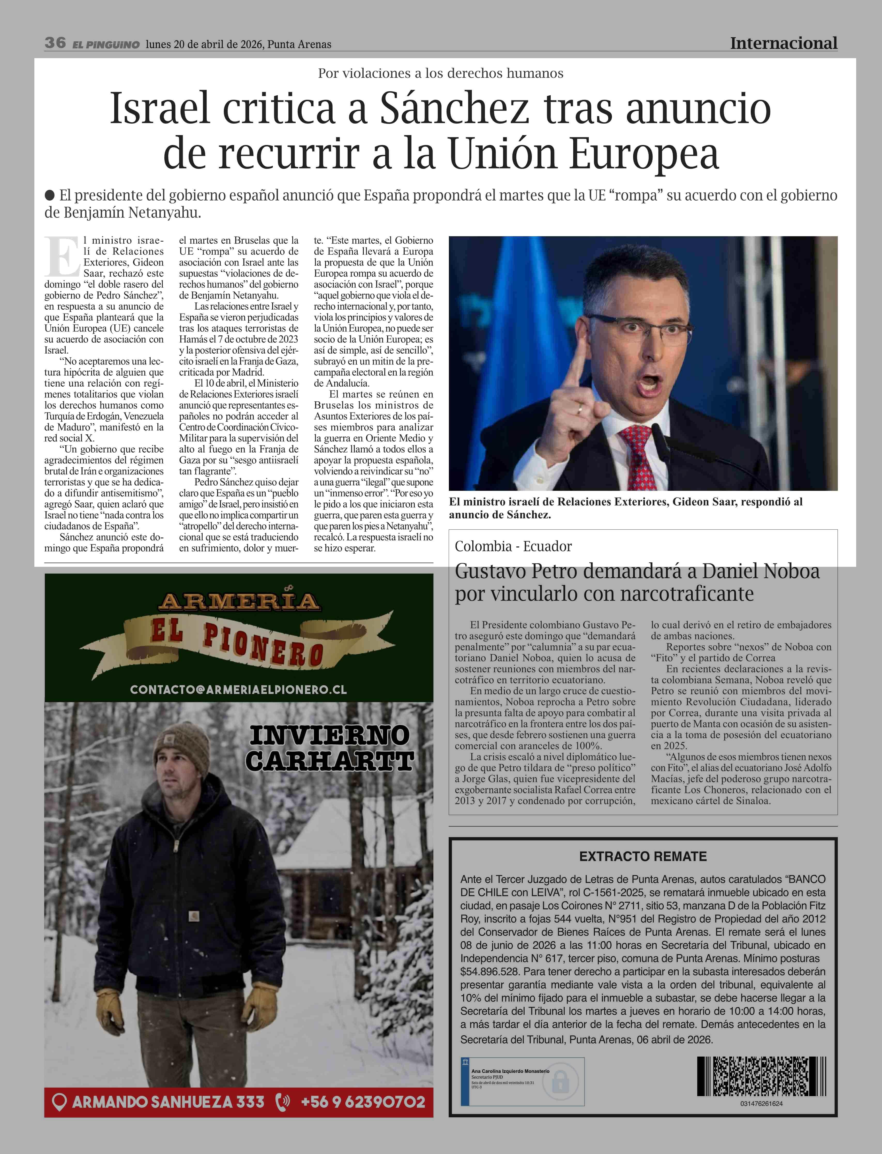 Israel critica a Sánchez tras anuncio de recurrir a la Unión Europea 20-04-2026 El Pingüino |