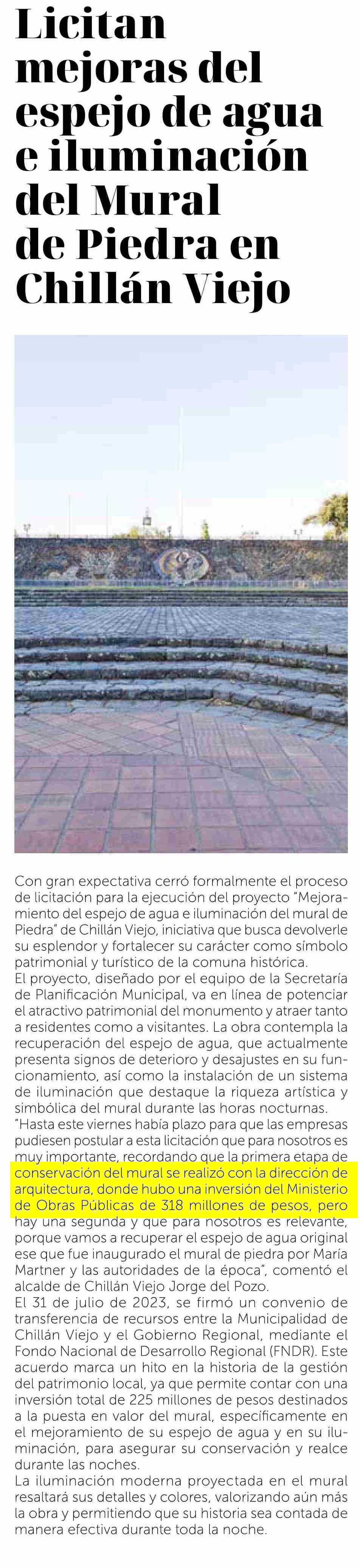 Licitan mejoras del espejo de agua e iluminación del Mural de Piedra en Chillán Viejo 27-05-2025 La Discusión |
