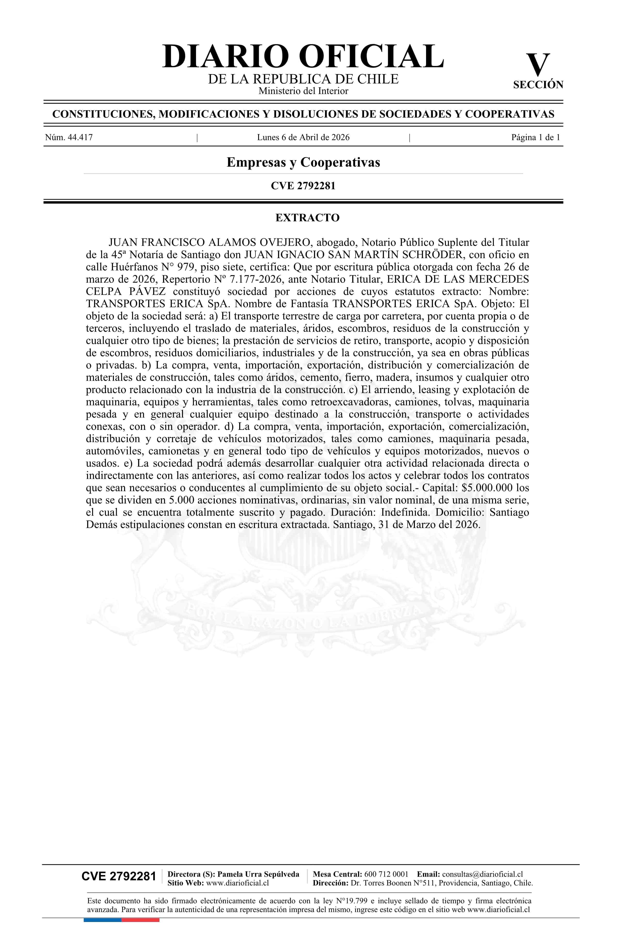 Título: TRANSPORTES ERICA SpA