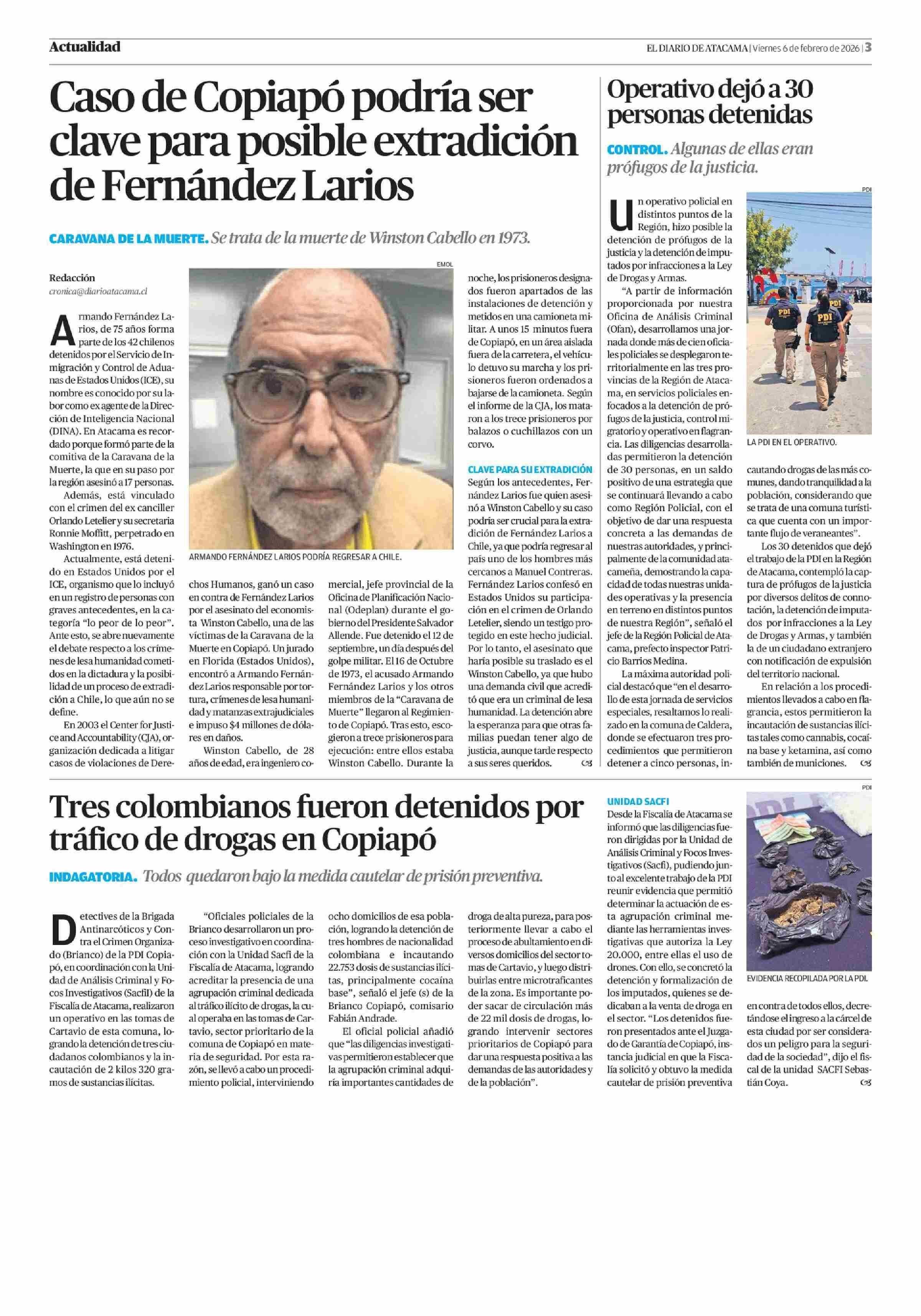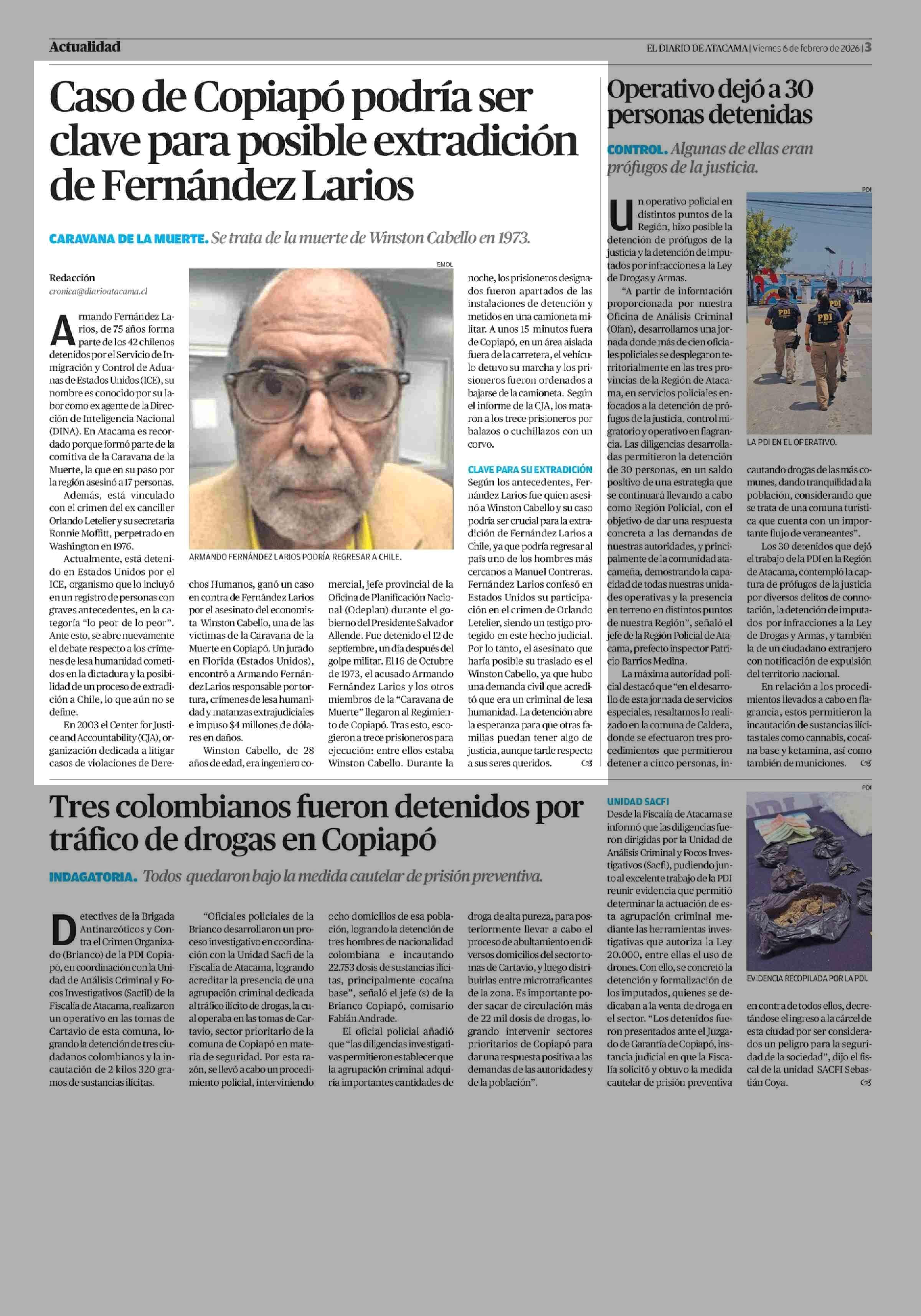 Caso de Copiapó podría ser clave para posible extradición de Fernández Larios 06-02-2026 El Diario de Atacama |