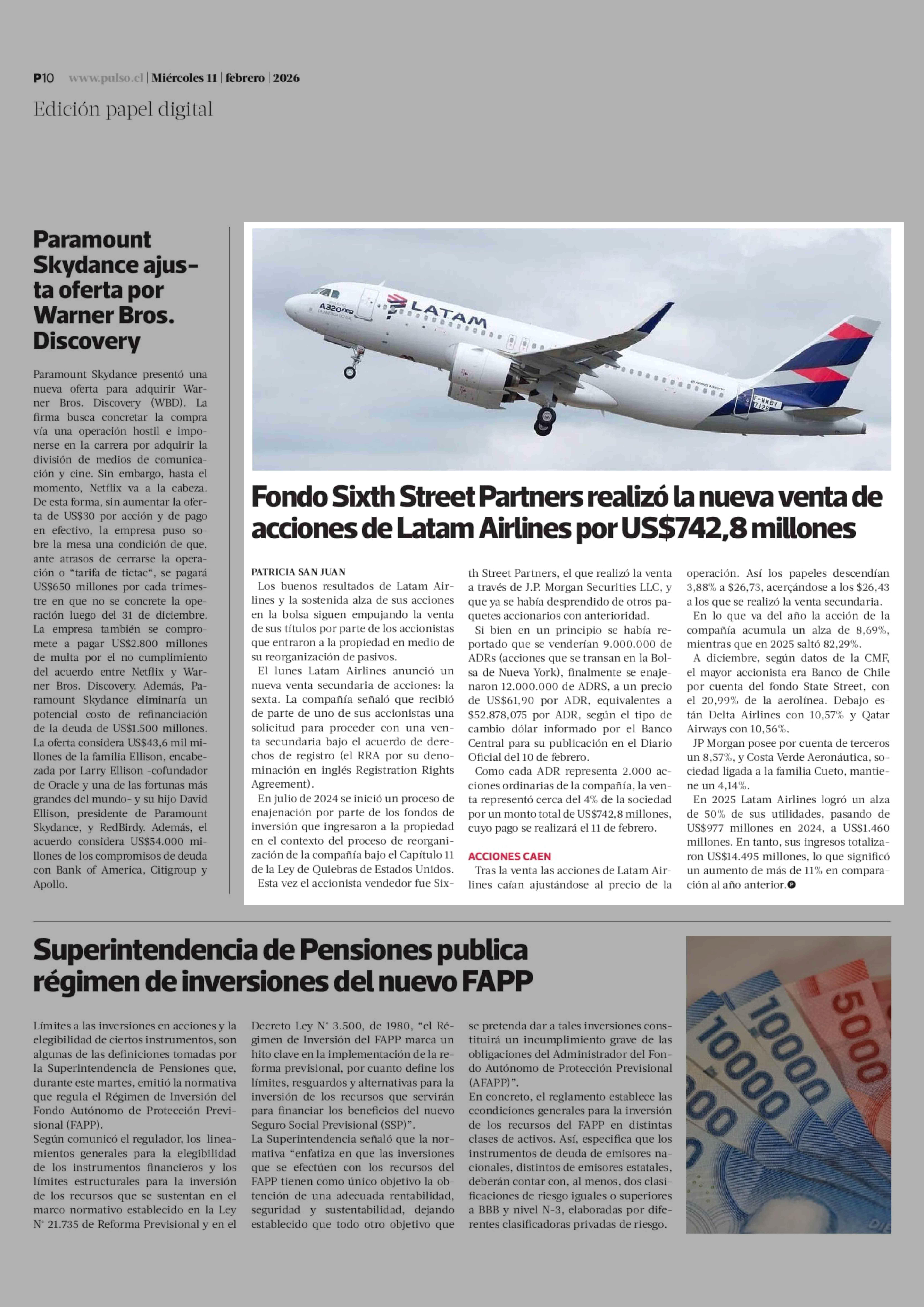 Fondo Sixth Street Partners realizó la nueva venta de acciones de Latam Airlines por US$742,8 millones 11-02-2026 La Tercera |