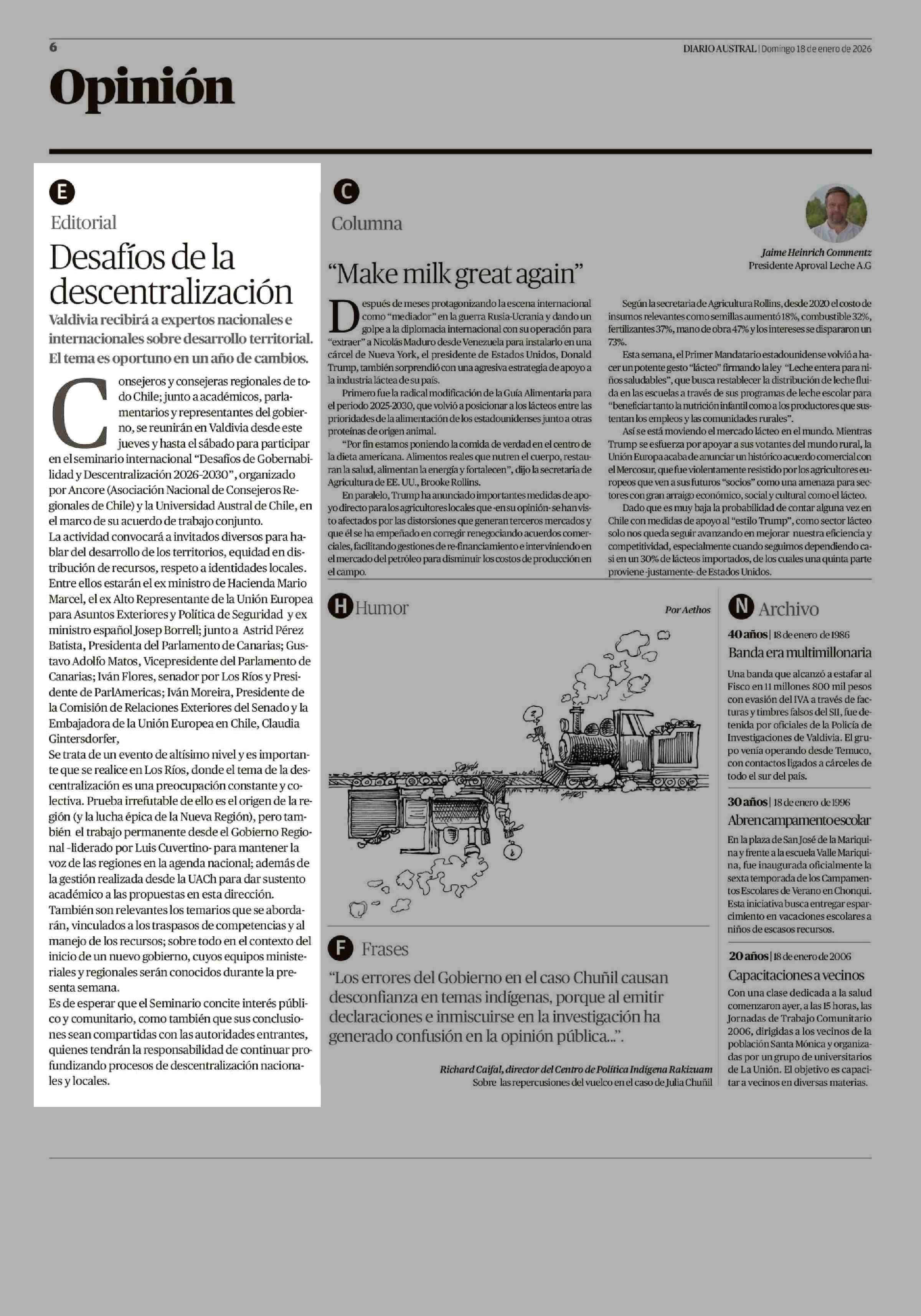 Editorial: Desafíos de la descentralización 18-01-2026 Diario Austral Región de Los Ríos |