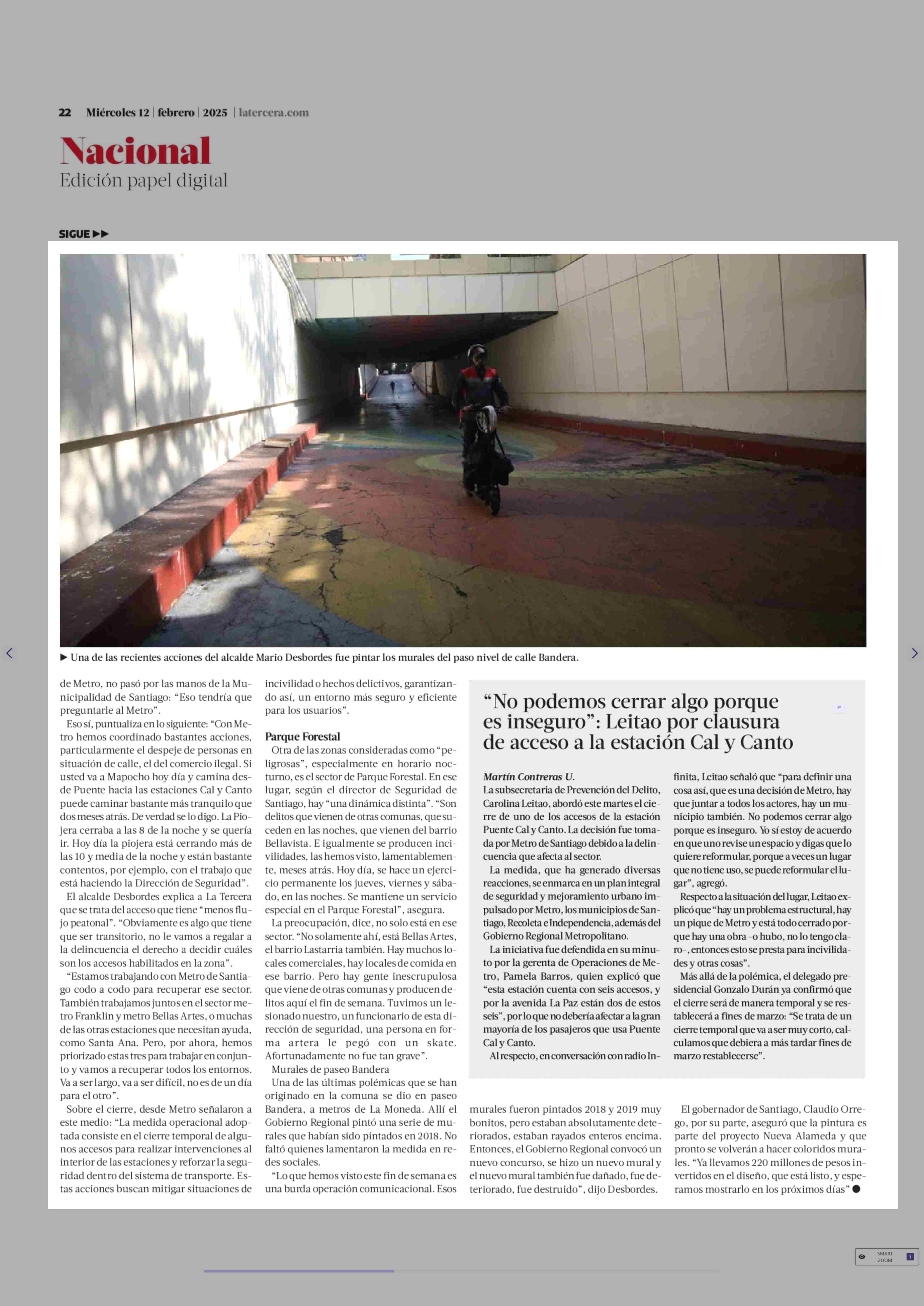 Director de Prevención y Seguridad de Santiago: “Hemos bajado más de un 30% los delitos en dos meses” 12-02-2025 La Tercera |
