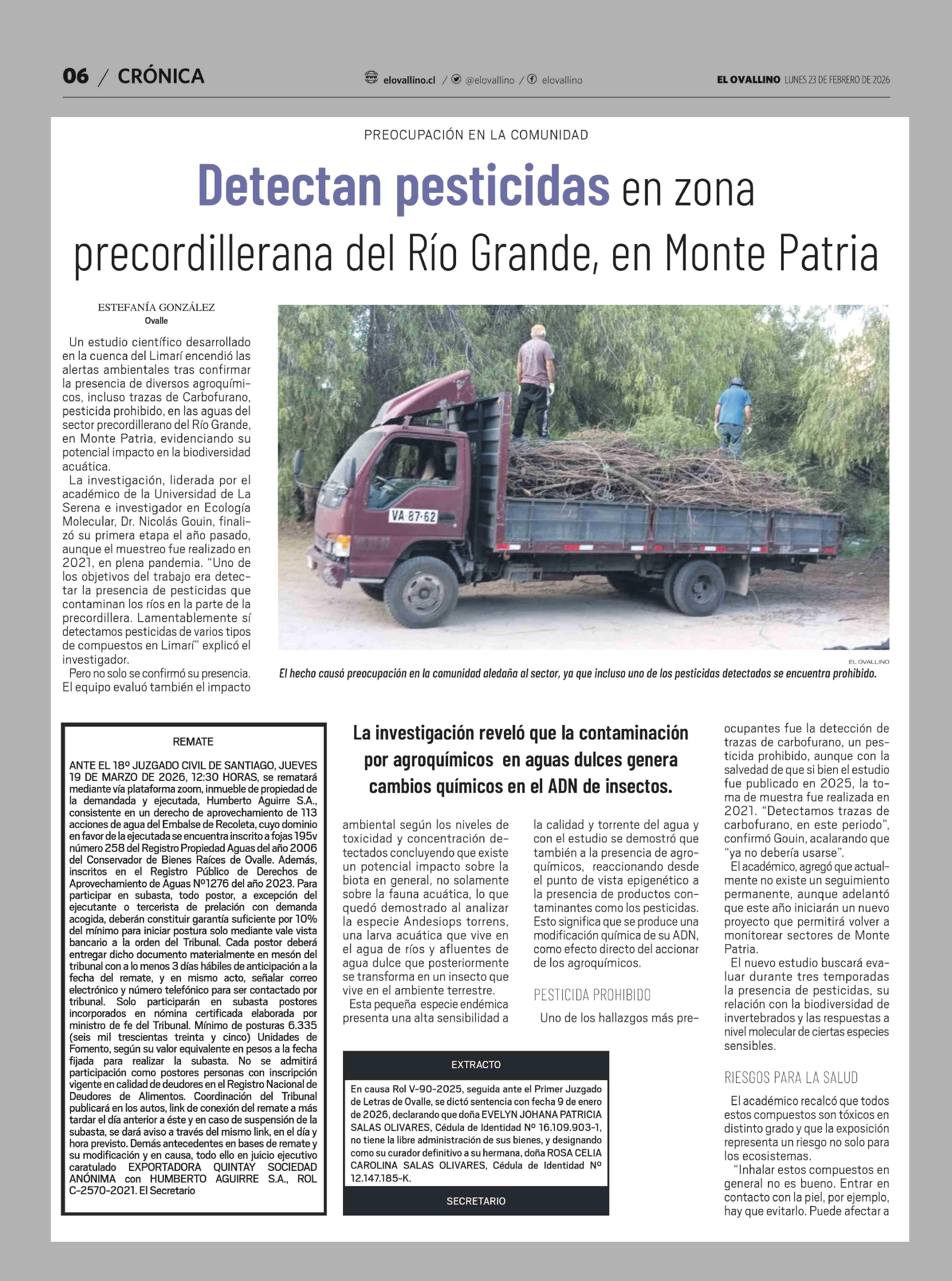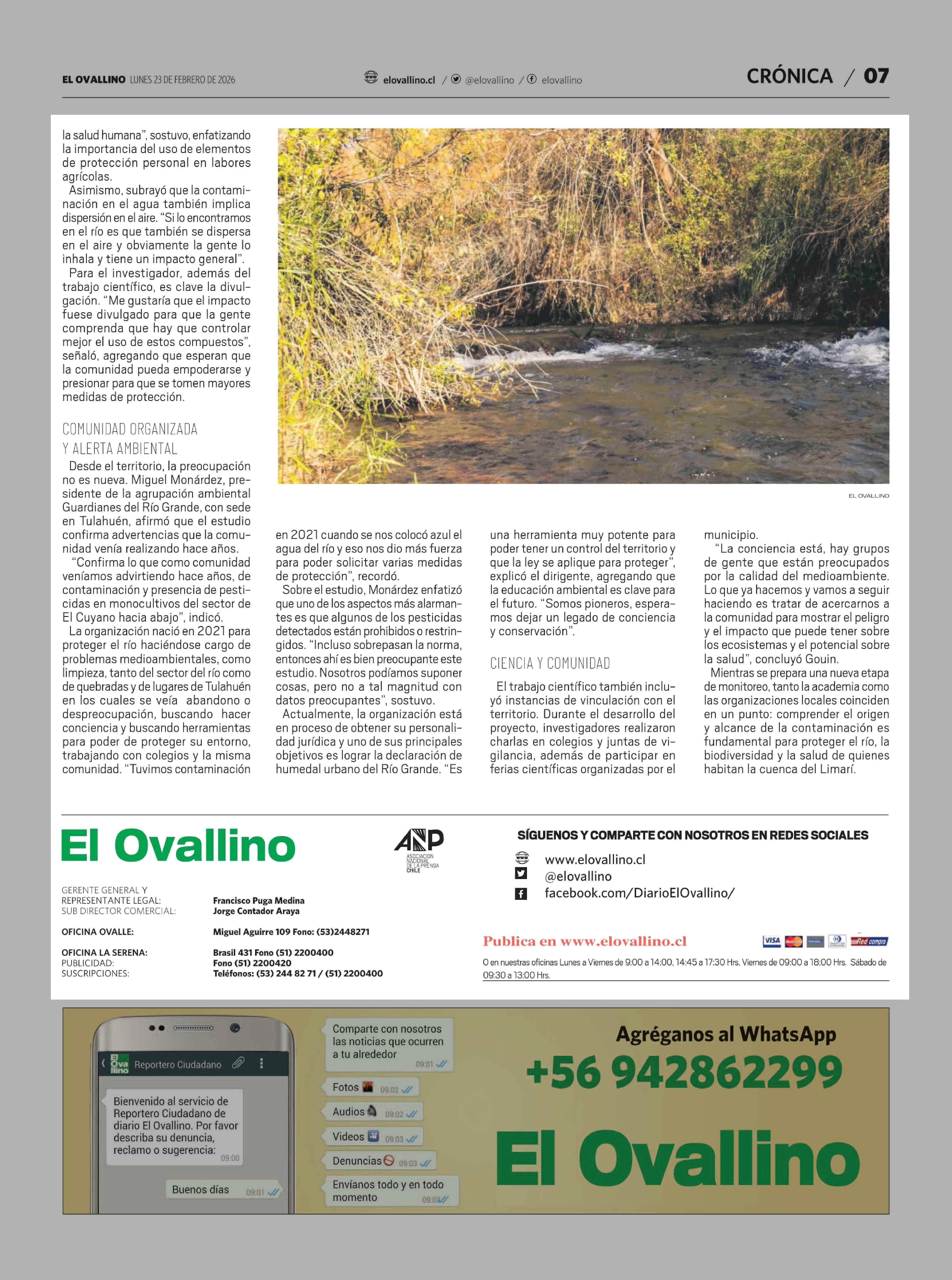 Detectan pesticidas en zona precordillerana del Río Grande, en Monte Patria 23-02-2026 El Ovallino |