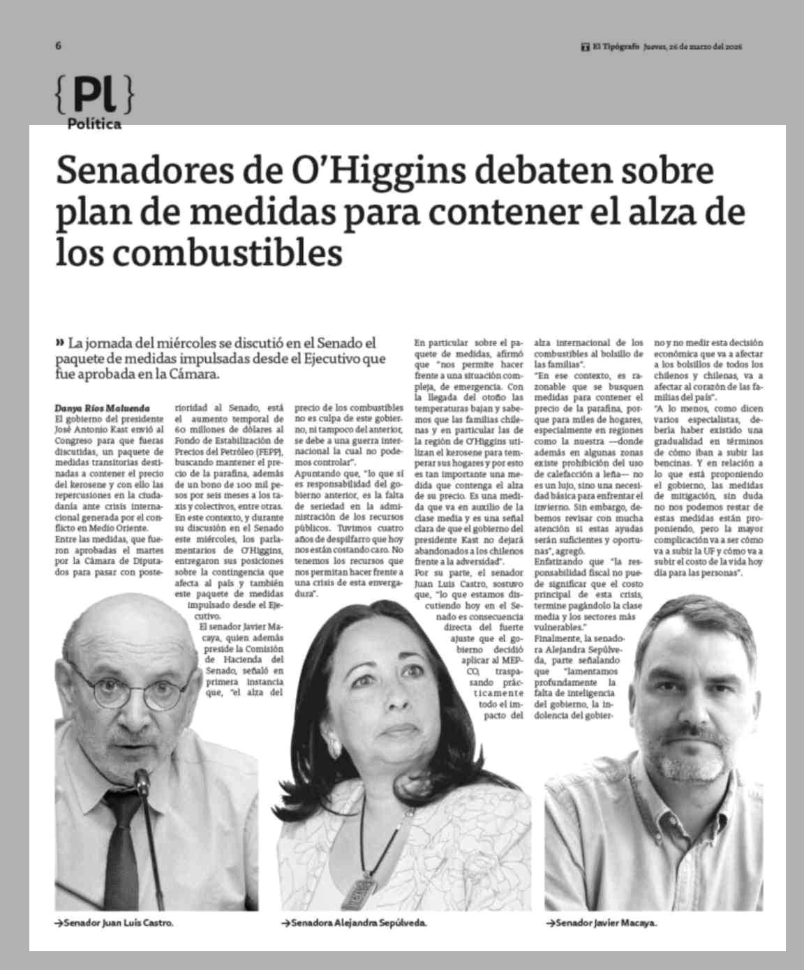 Senadores de O'Higgins debaten sobre plan de medidas para contener el alza de los combustibles 26-03-2026 El Tipógrafo |