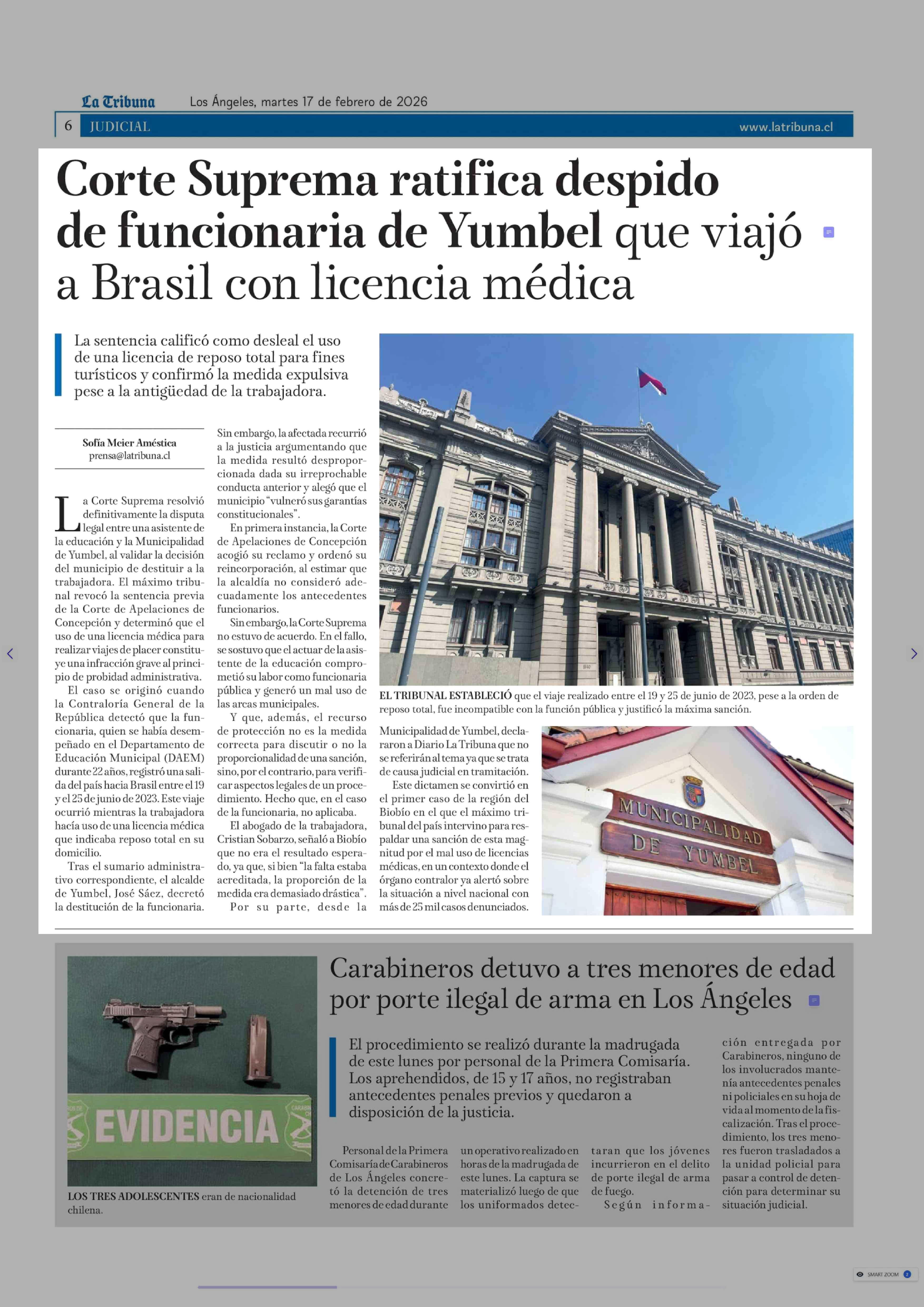 Corte Suprema ratifica despido de funcionaria de Yumbel que viajó a Brasil con licencia médica 17-02-2026 La Tribuna |