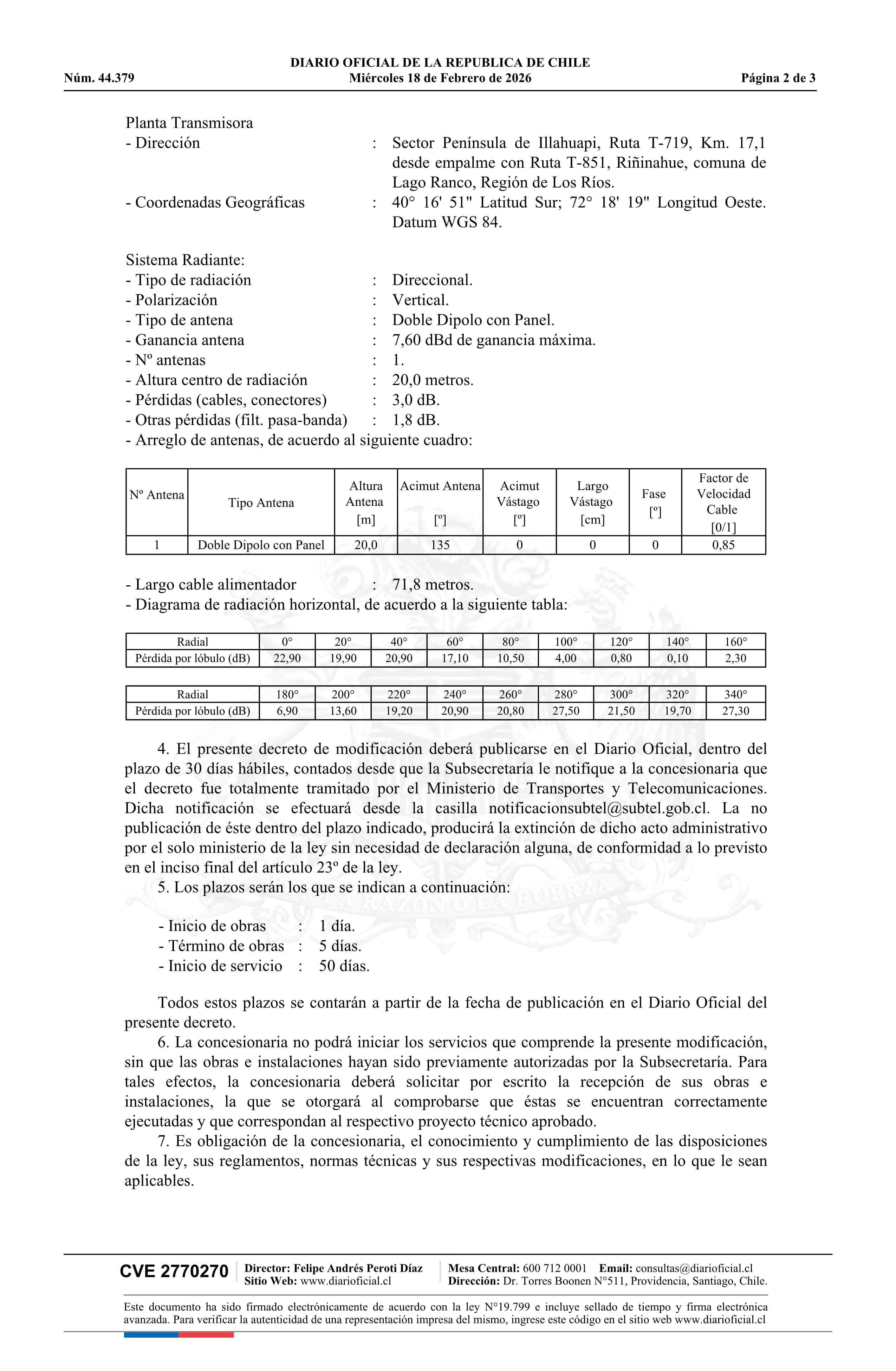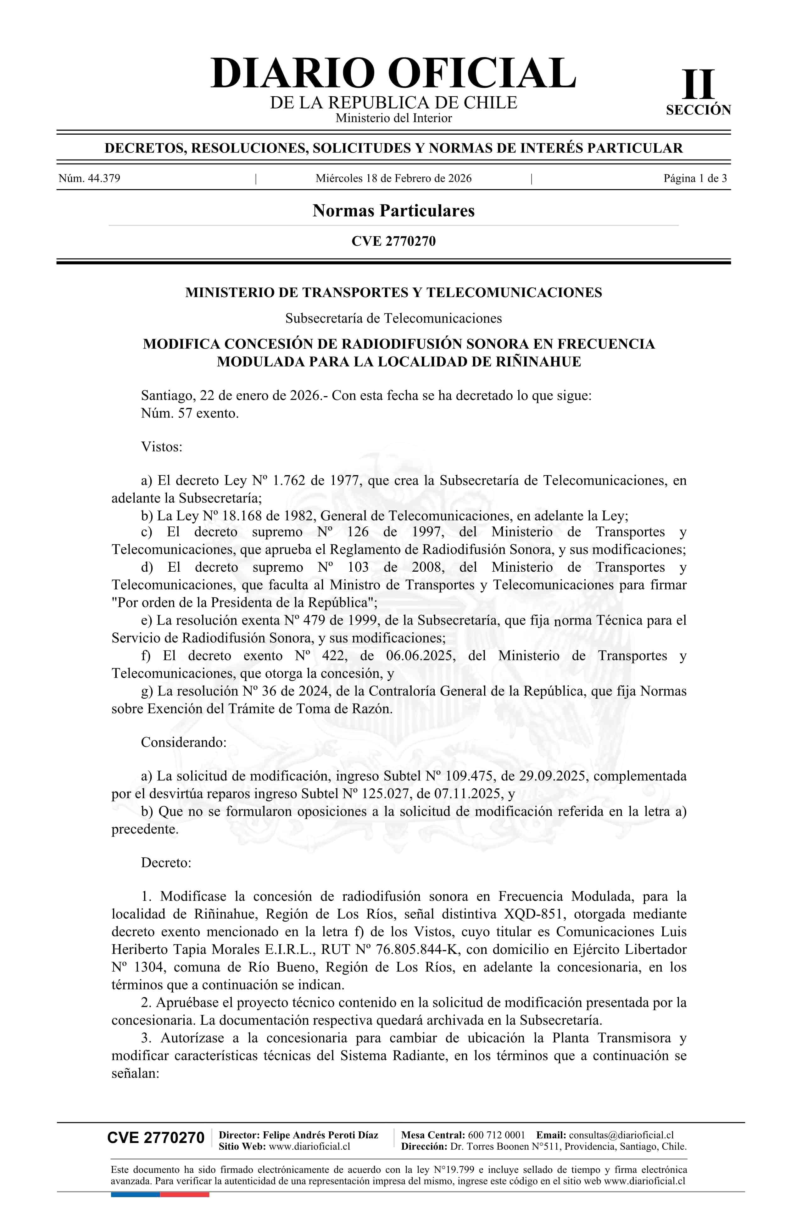 Título: Decreto exento número 57, de 2026.- Modifica concesión de radiodifusión sonora en frecuencia modulada para la localidad de Riñinahue
