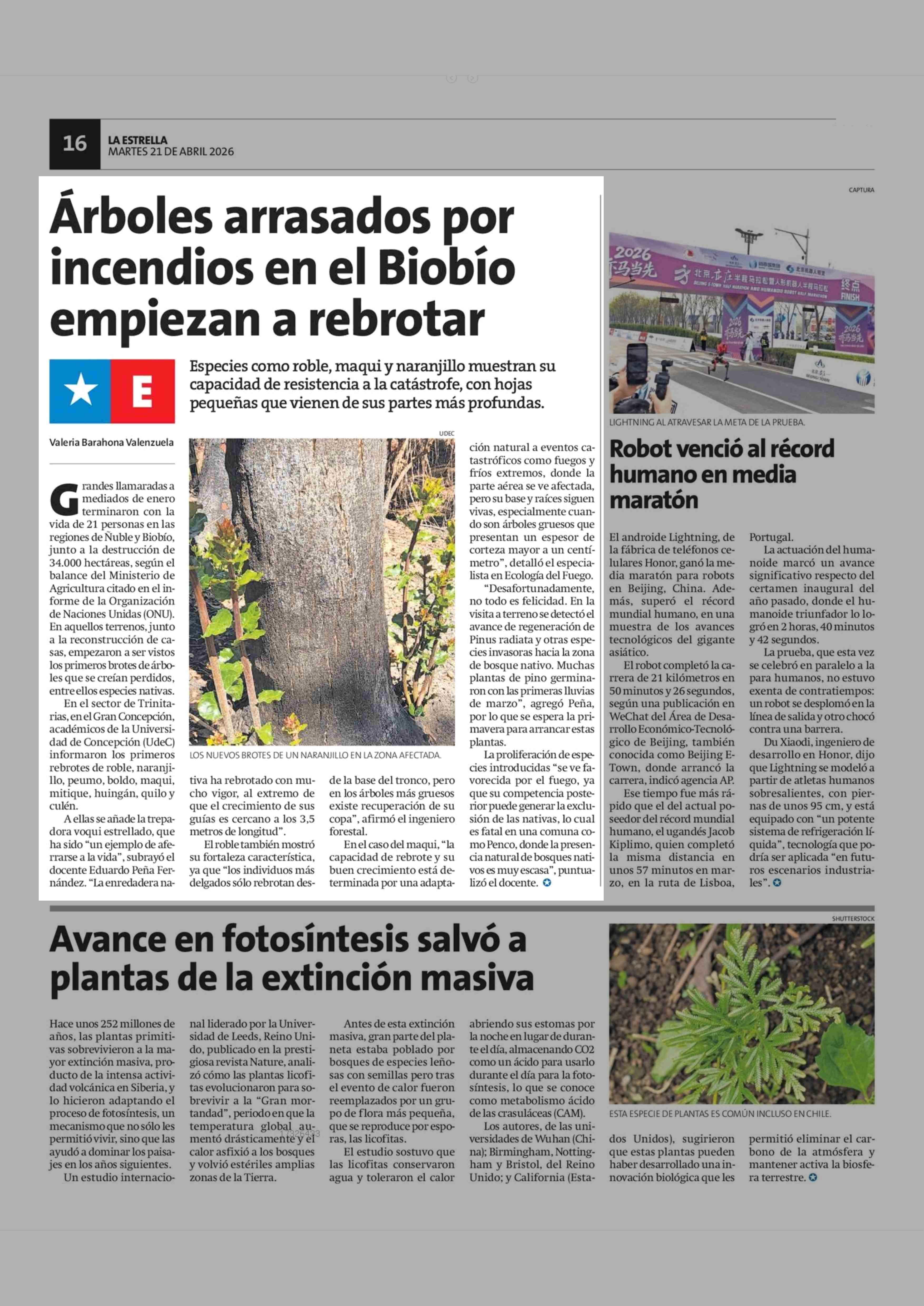 Arboles arrasados por incendios en el Biobío empiezan a rebrotar 21-04-2026 La Estrella de Antofagasta |