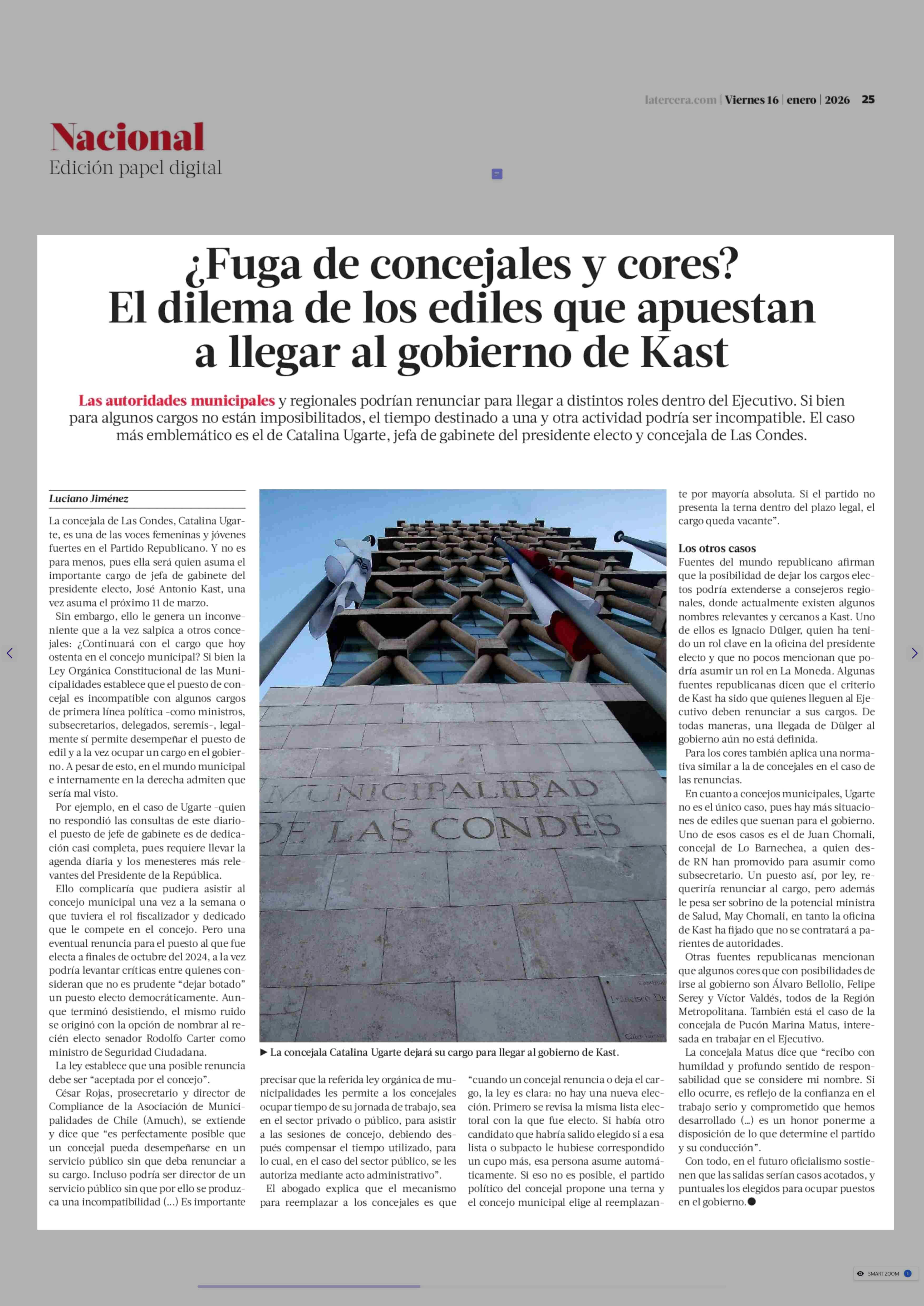 ;Fuga de concejales y cores? El dilema de los ediles que apuestan a llegar al gobierno de Kast 16-01-2026 La Tercera |