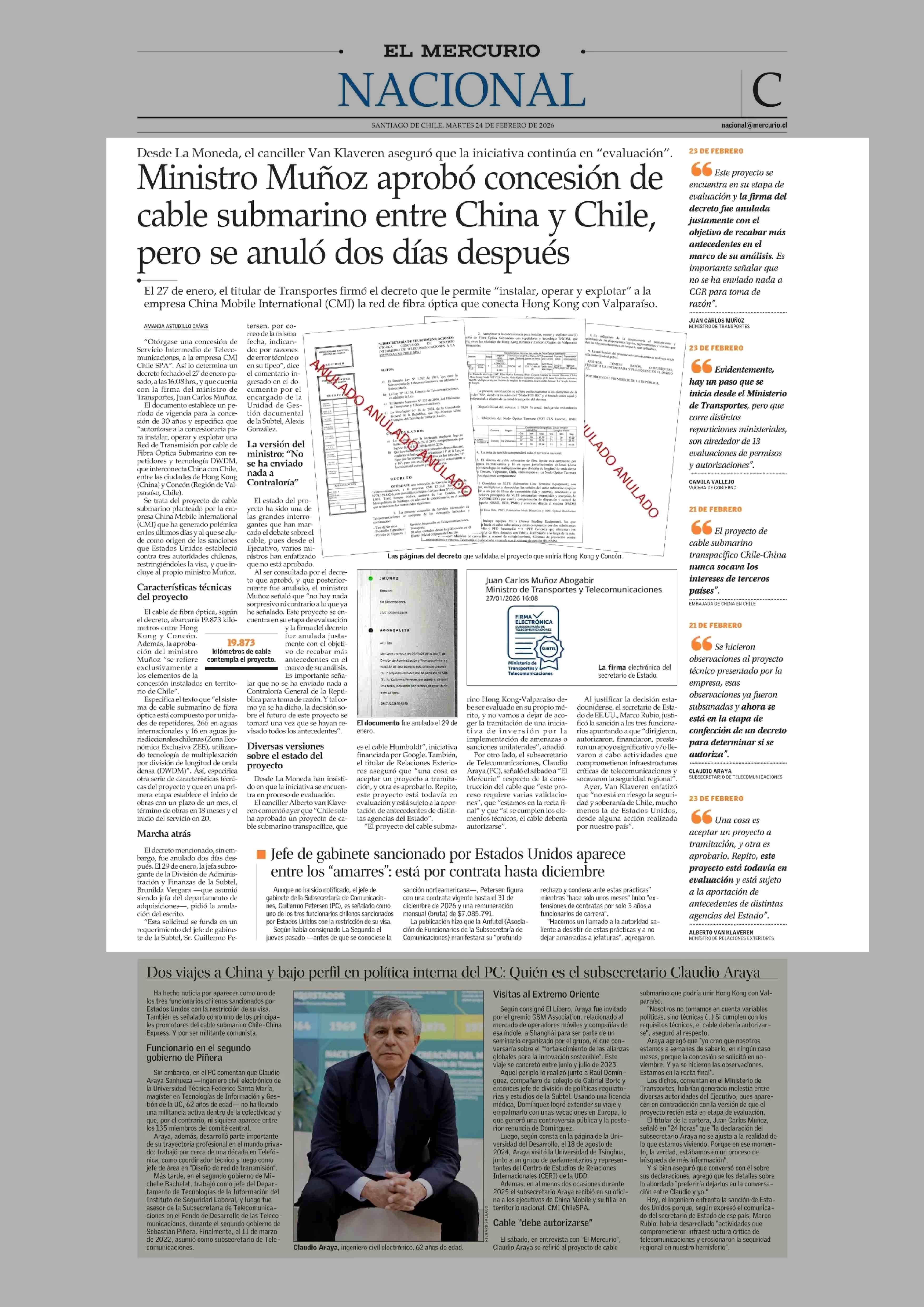 Ministro Muñoz aprobó concesión de cable submarino entre China y Chile, pero se anuló dos días después 24-02-2026 El Mercurio |