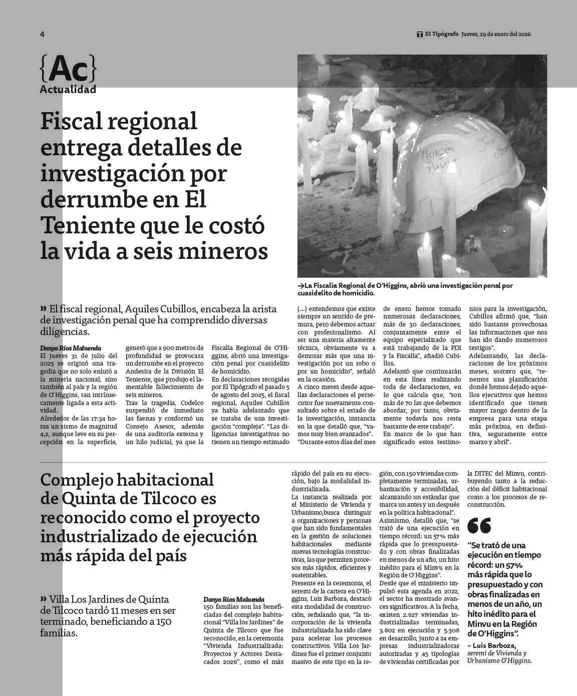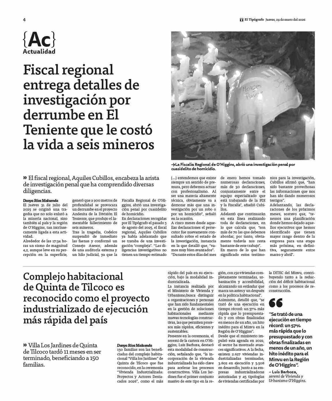 Fiscal regional entrega detalles de investigación por derrumbe en El Teniente que le costó la vida a seis mineros 29-01-2026 El Tipógrafo |