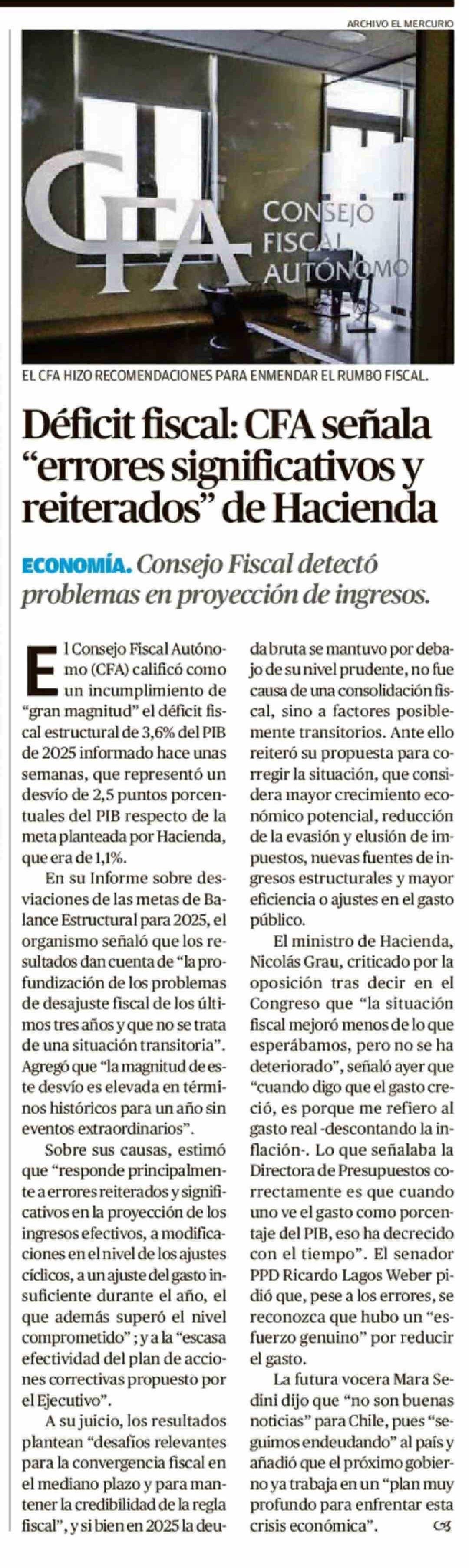 Título: Déficit fiscal: CFA señala "errores significativos y reiterados" de Hacienda