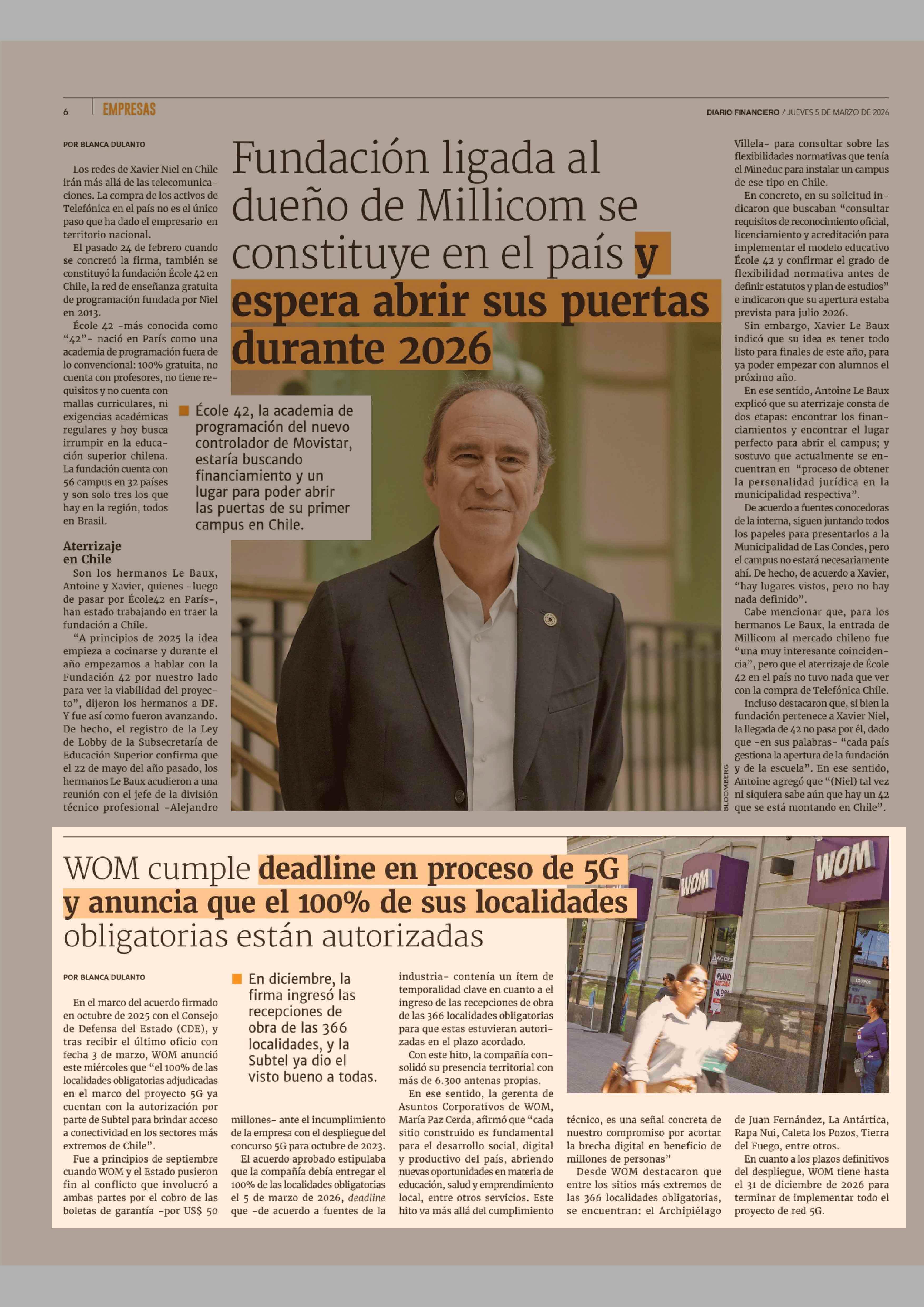 WOM cumple deadline en proceso de 5G y anuncia que el 100% de sus localidades obligatorias están autorizadas 05-03-2026 Diario Financiero |