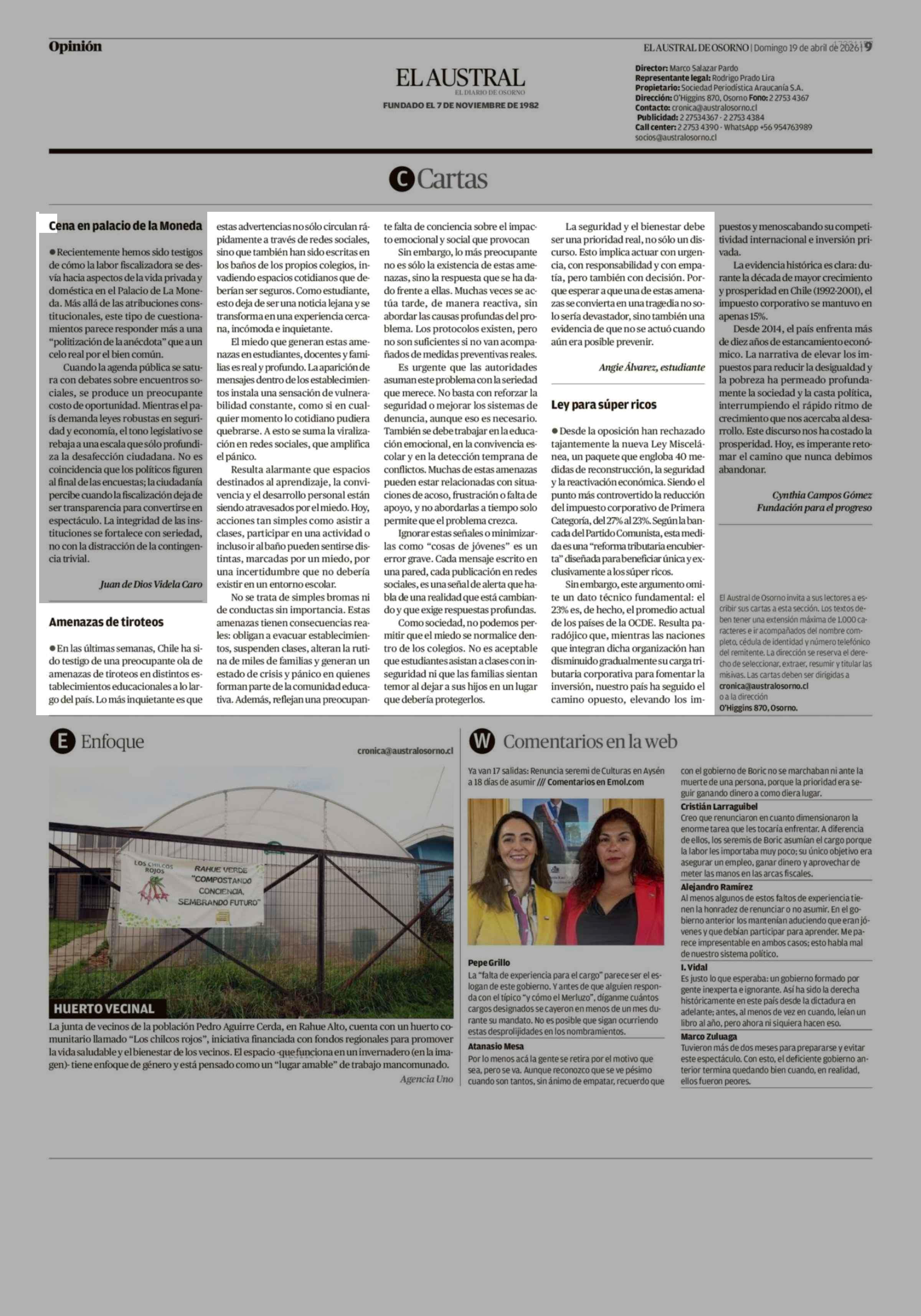 CARTAS: Amenazas de tiroteos 19-04-2026 El Austral de Osorno |