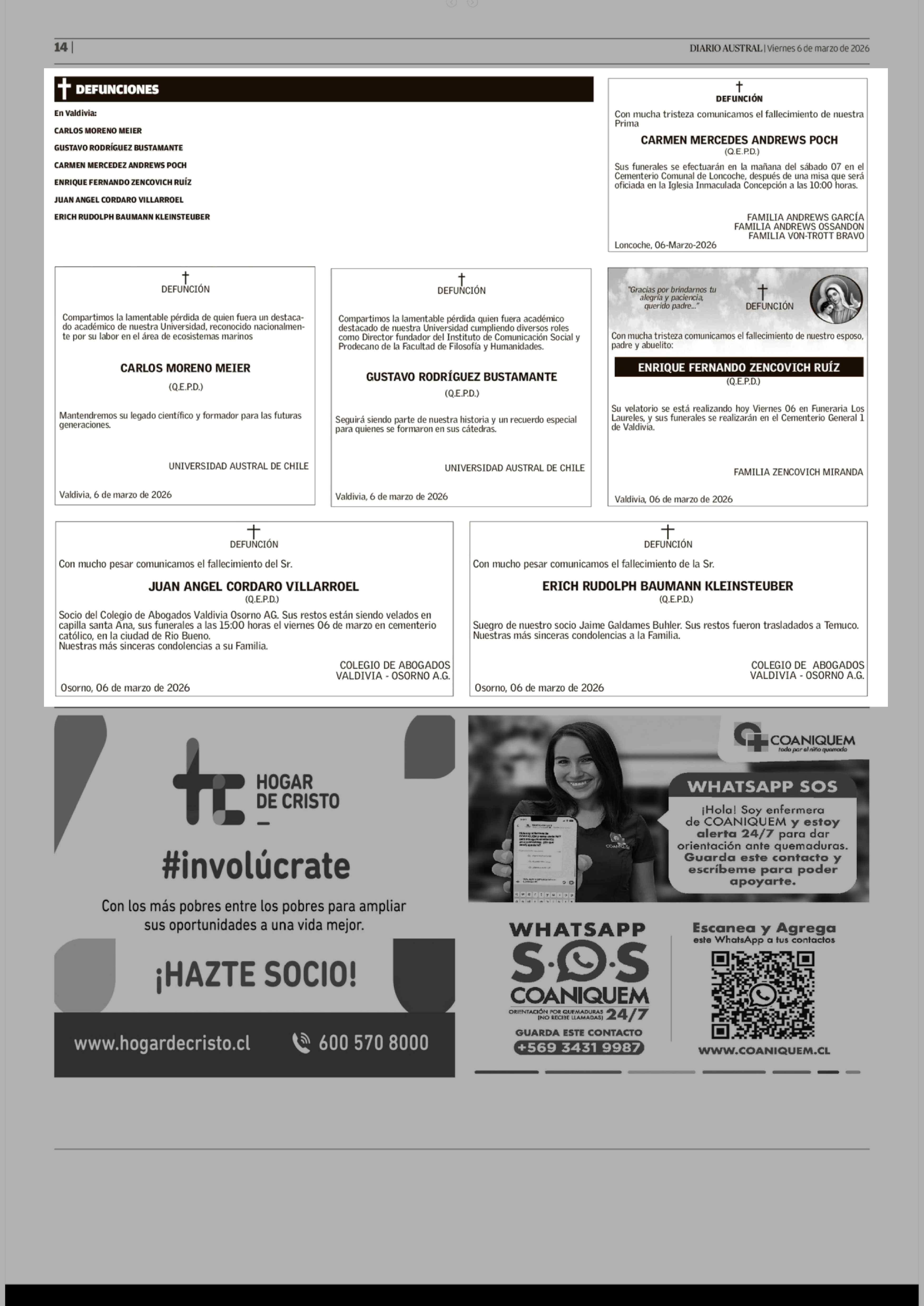 Obituario: + DEFUNCIONES 06-03-2026 Diario Austral Región de Los Ríos |