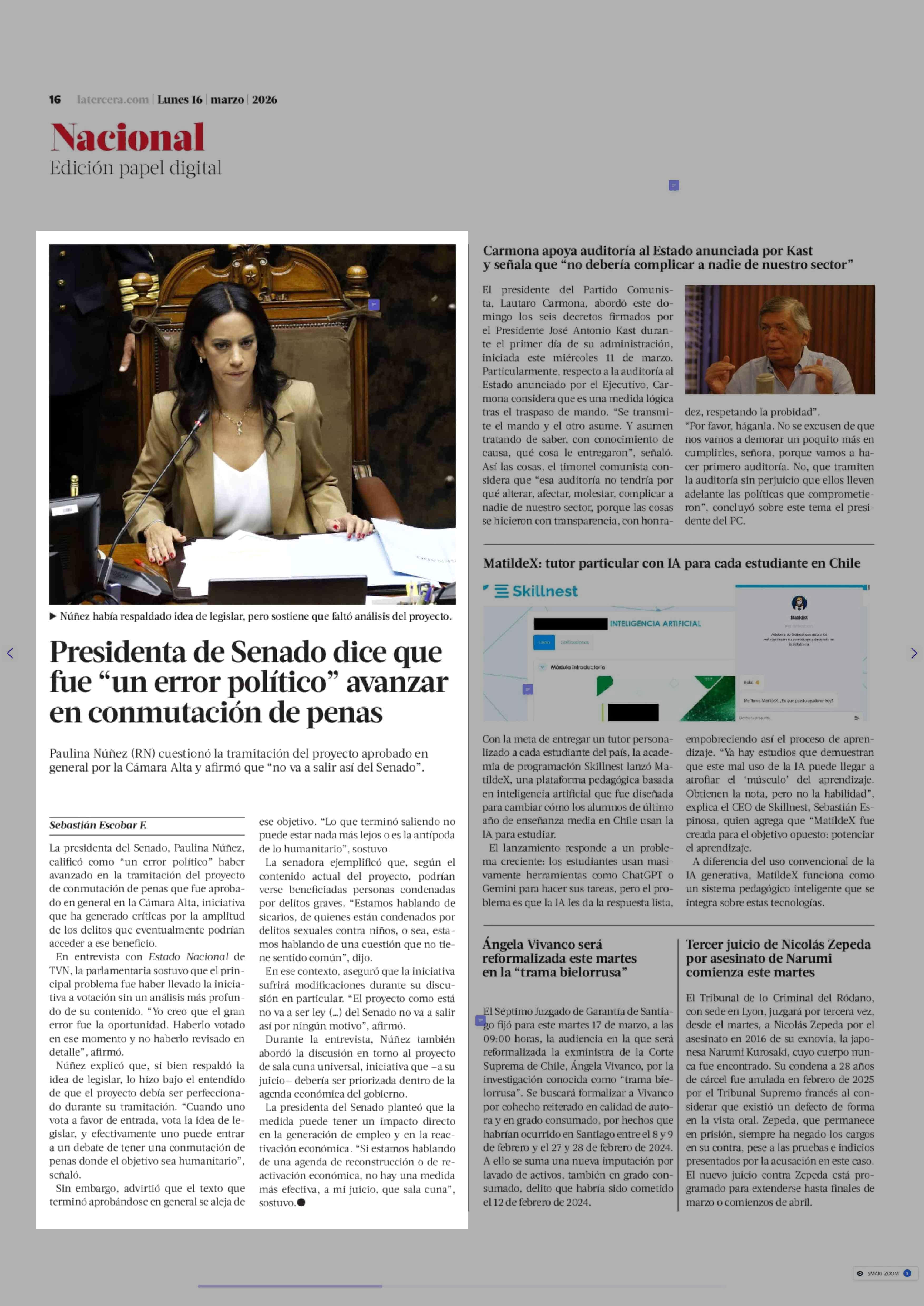 Presidenta de Senado dice que fue "un error político" avanzar en conmutación de penas 16-03-2026 La Tercera |