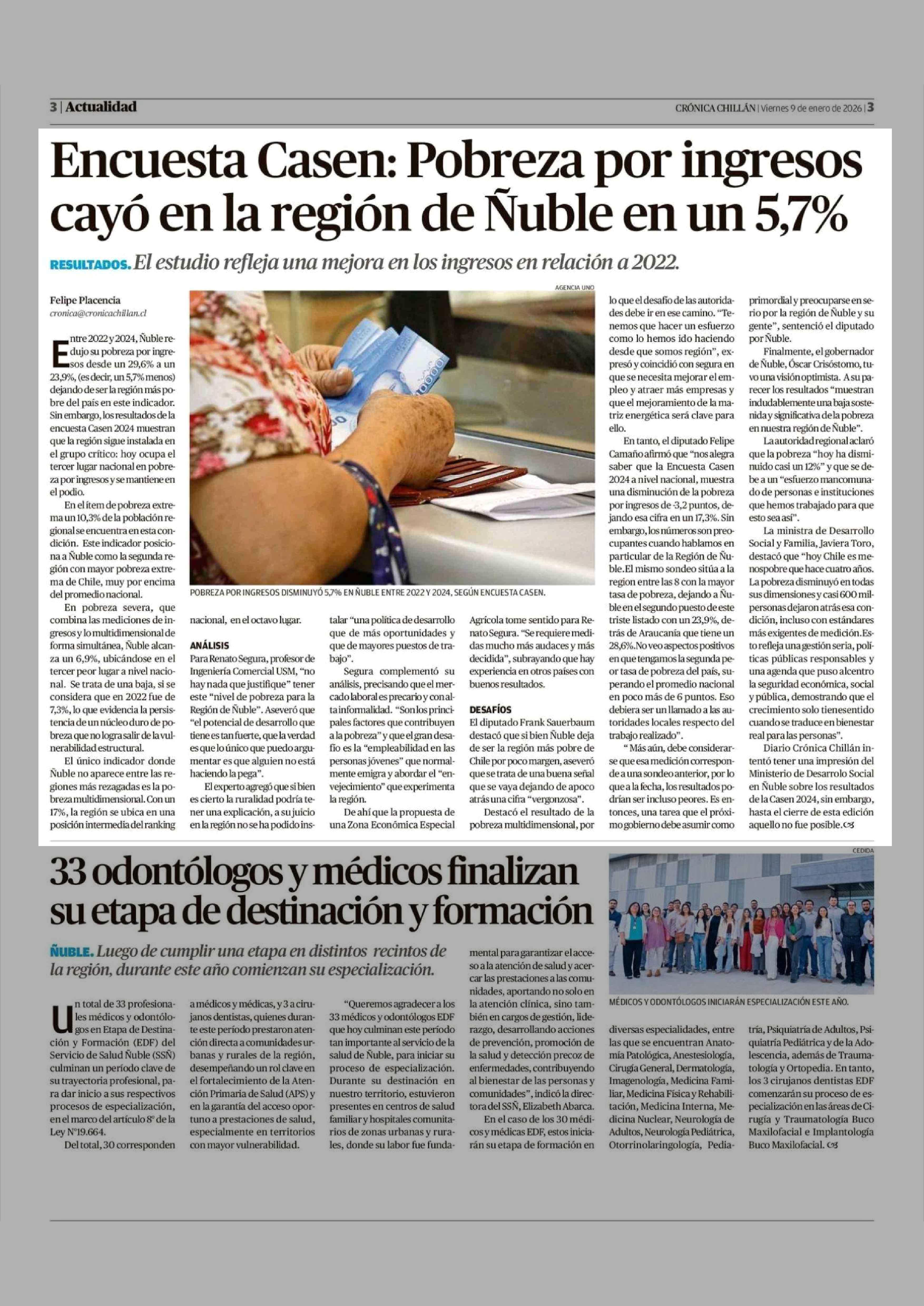 Encuesta Casen: Pobreza por ingresos cayó en la región de Nuble en un 5,7% 09-01-2026 Crónica de Chillán |