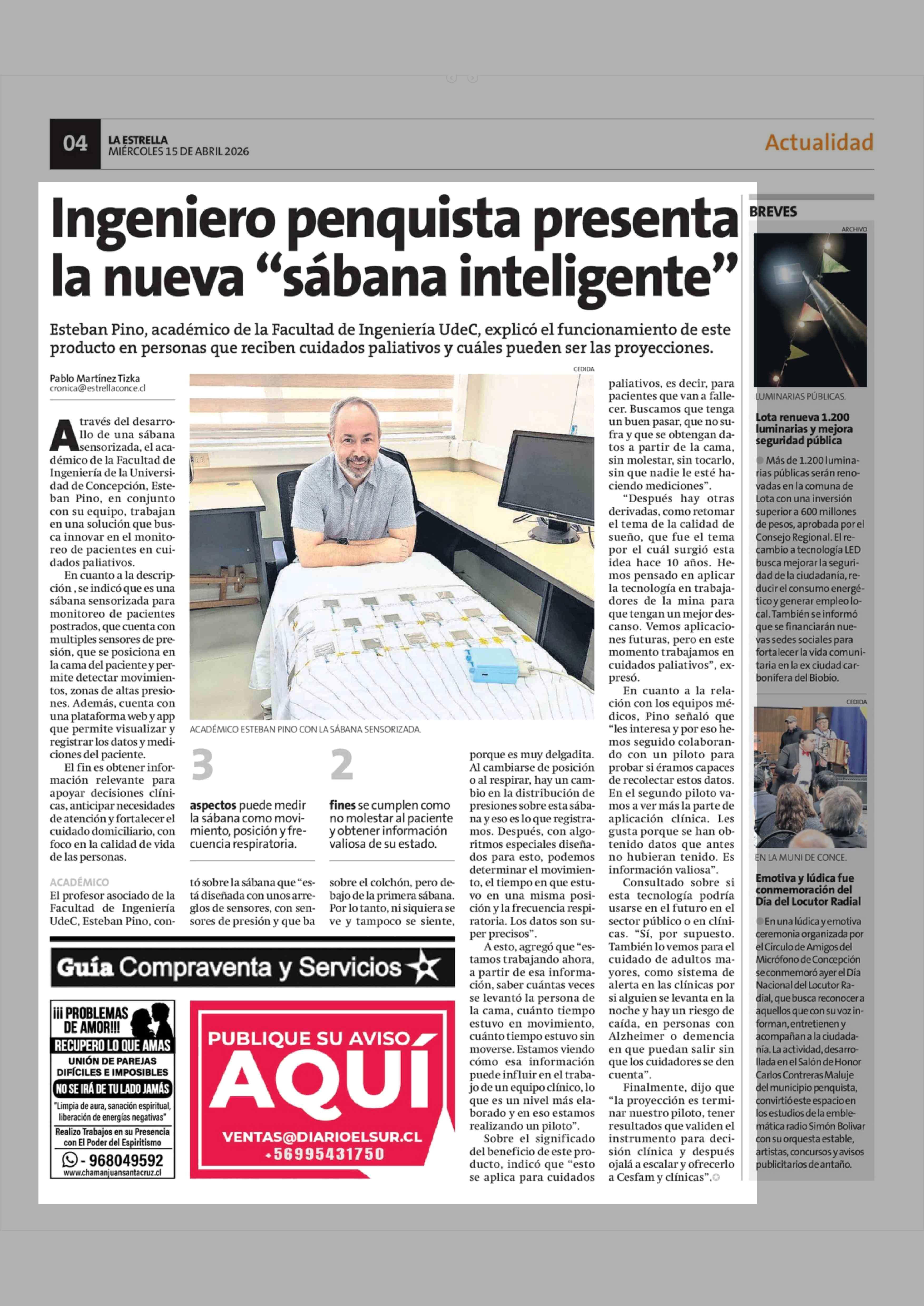 Ingeniero penquista presenta la nueva "sábana inteligente" 15-04-2026 La Estrella de Concepción |