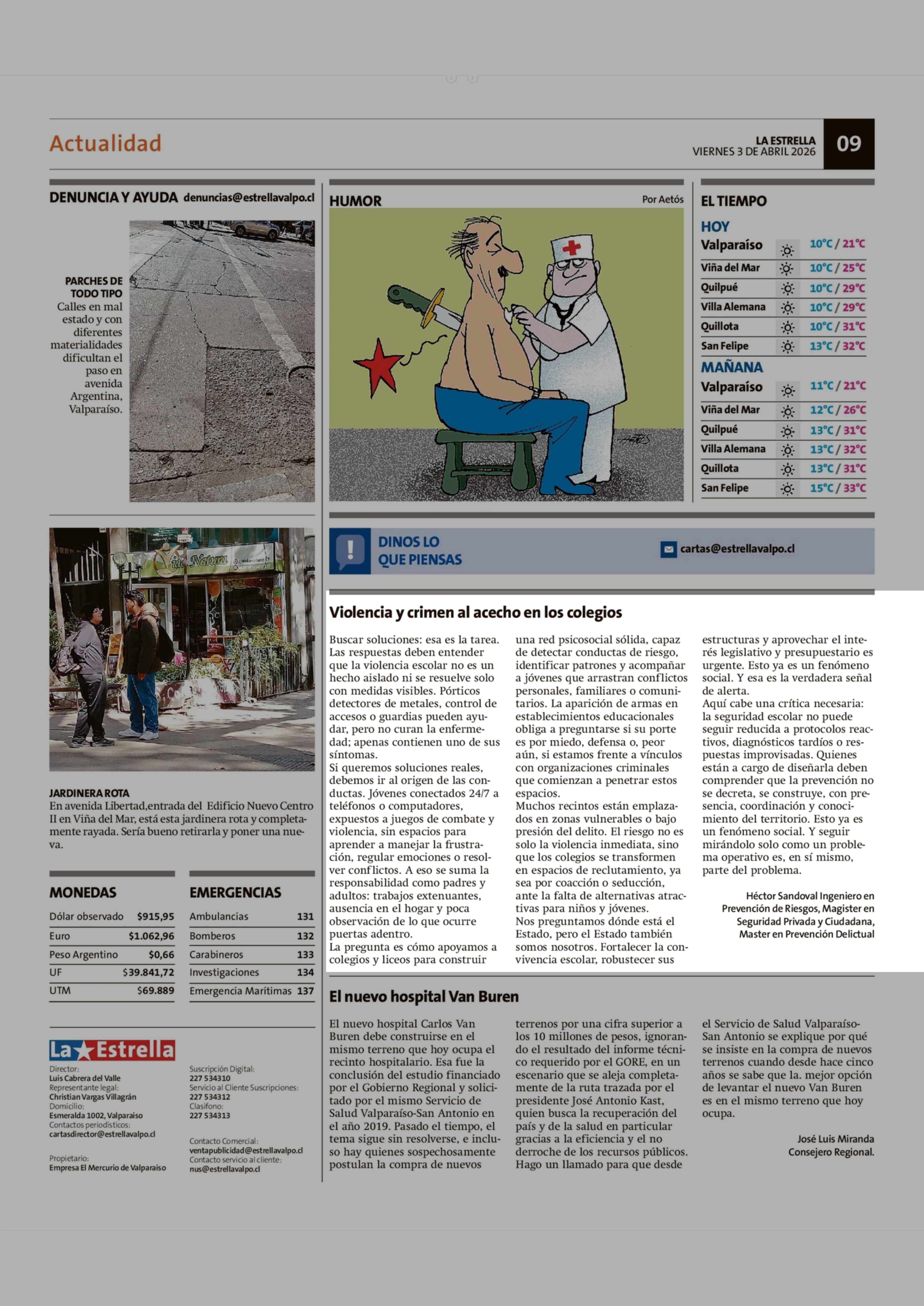 COLUMNAS DE OPINIÓN: Violencia y crimen al acecho en los colegios 03-04-2026 La Estrella de Valparaíso |