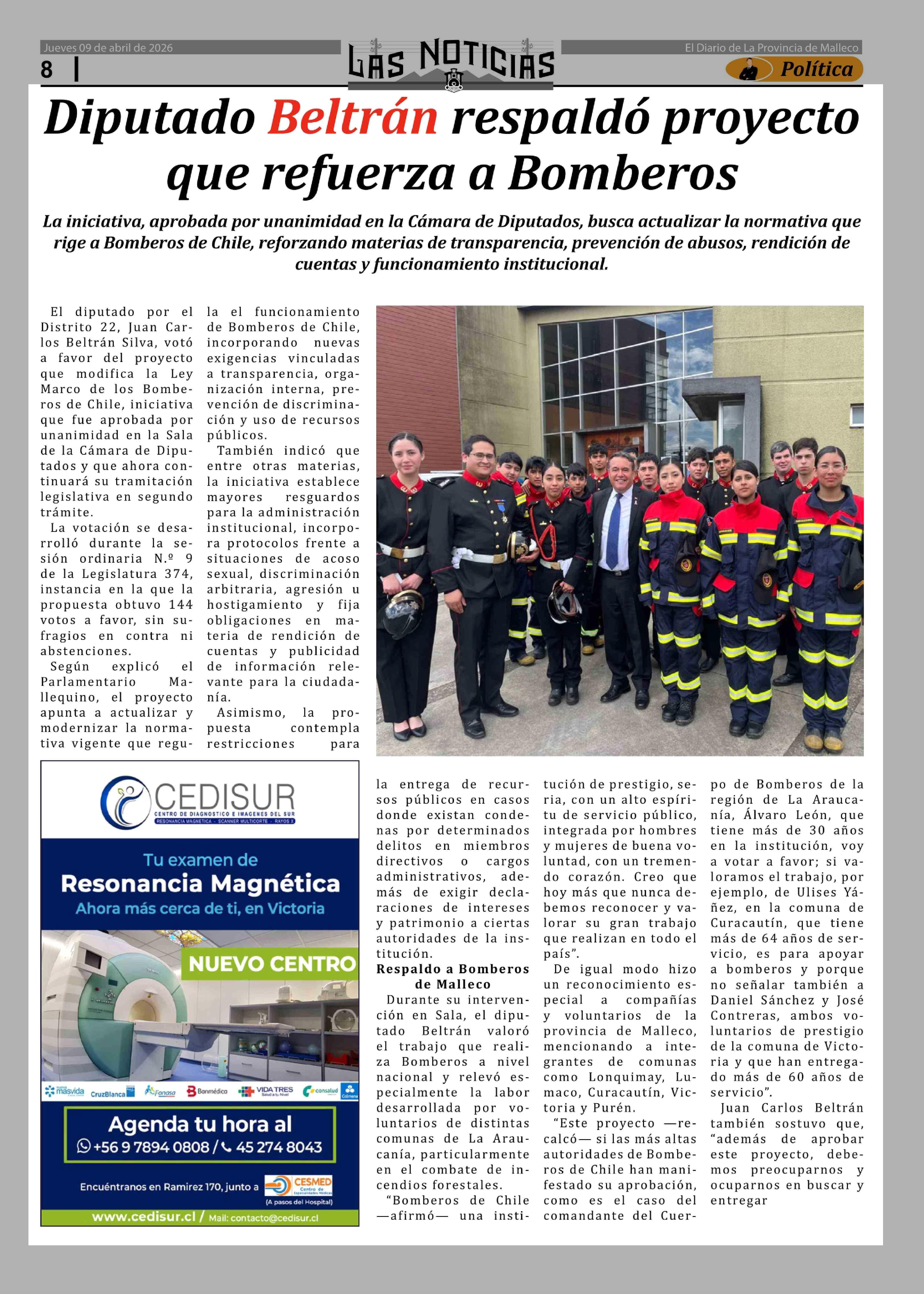 Diputado Beltrán respaldó proyecto que refuerza a Bomberos 09-04-2026 Las Noticias |