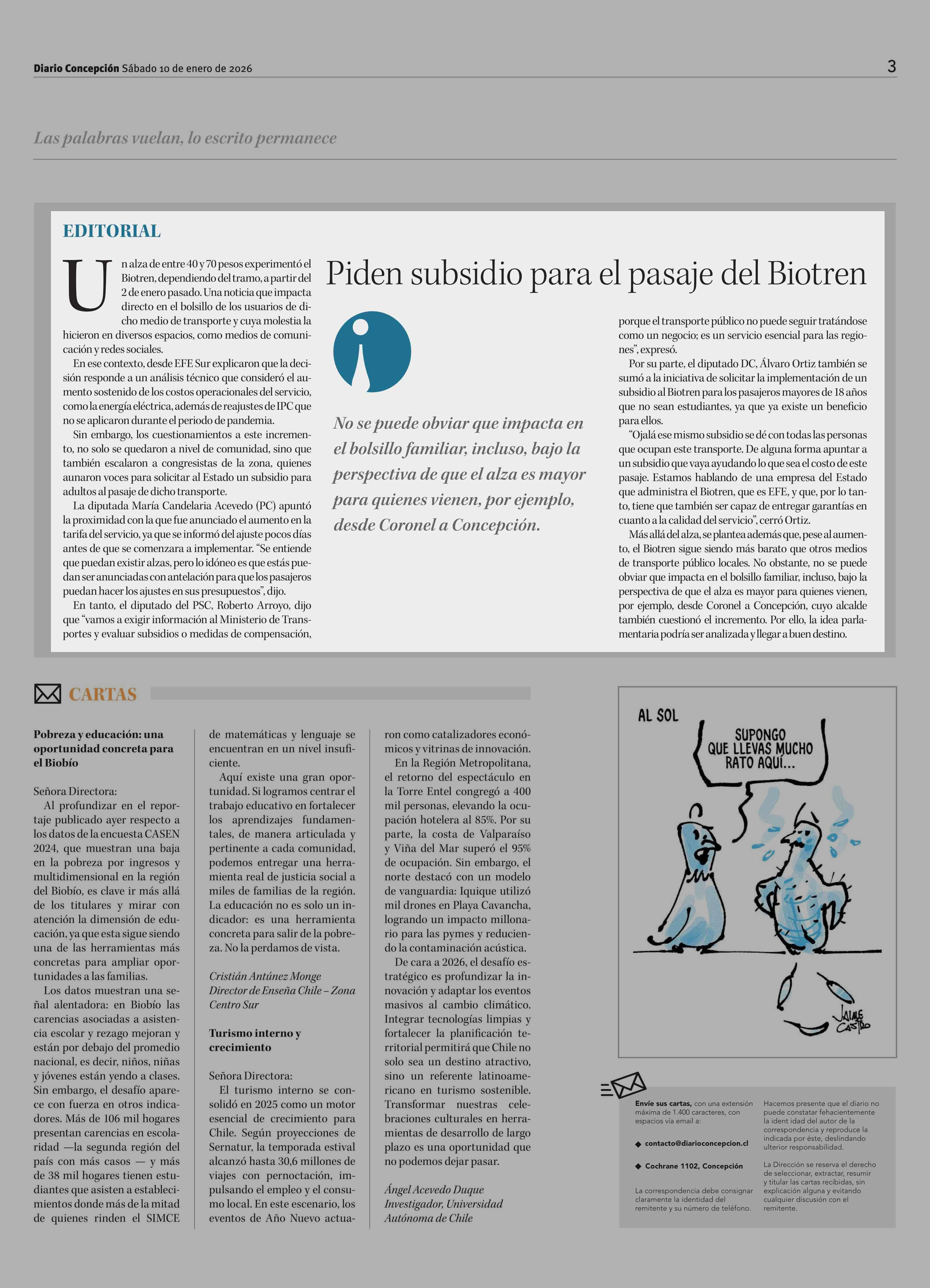 Editorial: Piden subsidio para el pasaje del Biotren 10-01-2026 Diario Concepción |