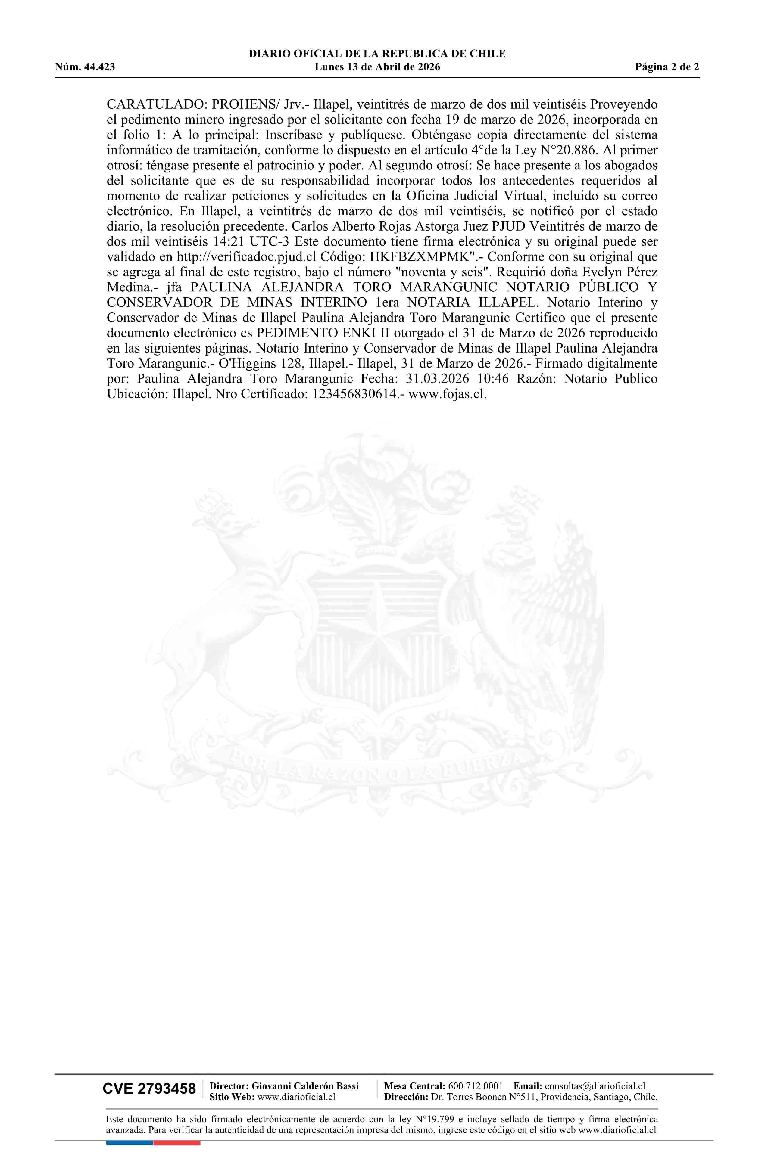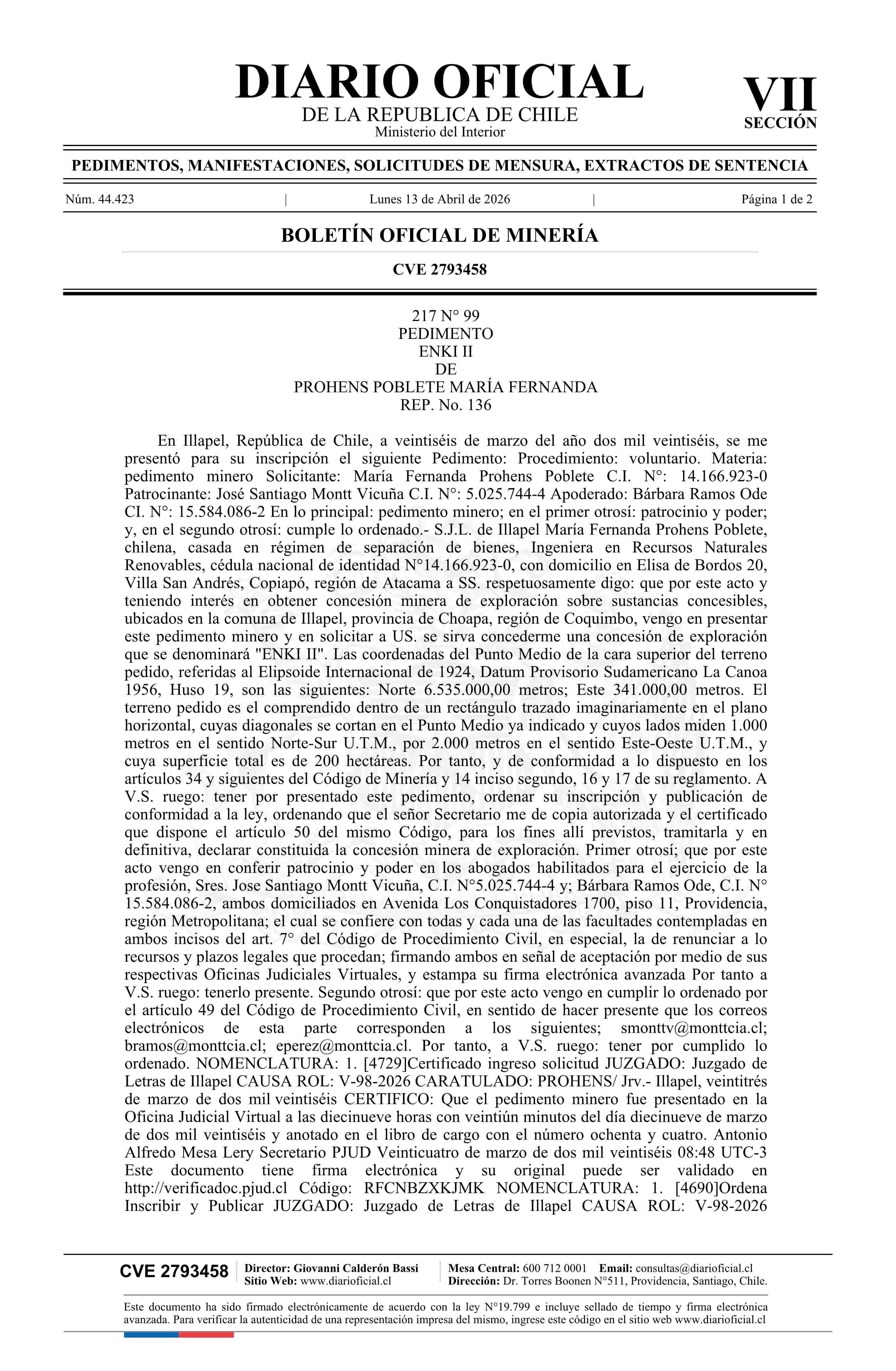 ENKI II / Prohens Poblete María Fernanda 13-04-2026 DIARIO OFICIAL CHILE - BOLETÍN OFICIAL DE MINERÍA |