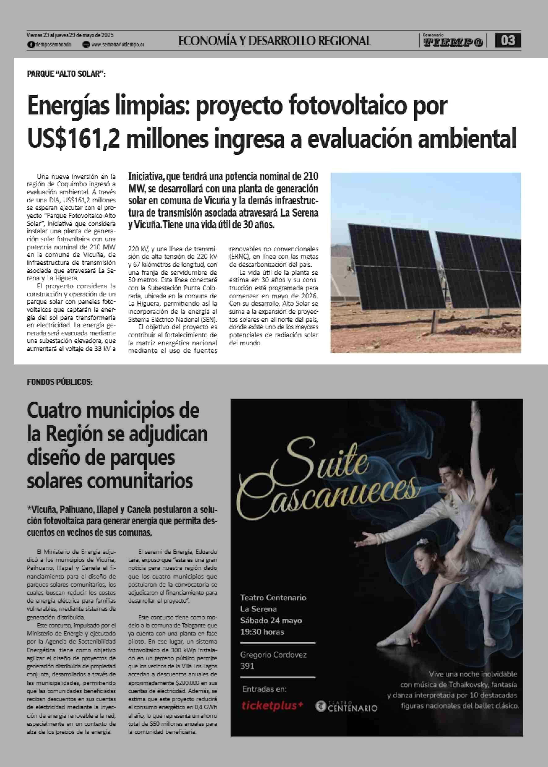 Energías limpias: proyecto fotovoltaico por US$161,2 millones ¡ngresa a evaluación ambiental 26-05-2025 Semanario Tiempo |