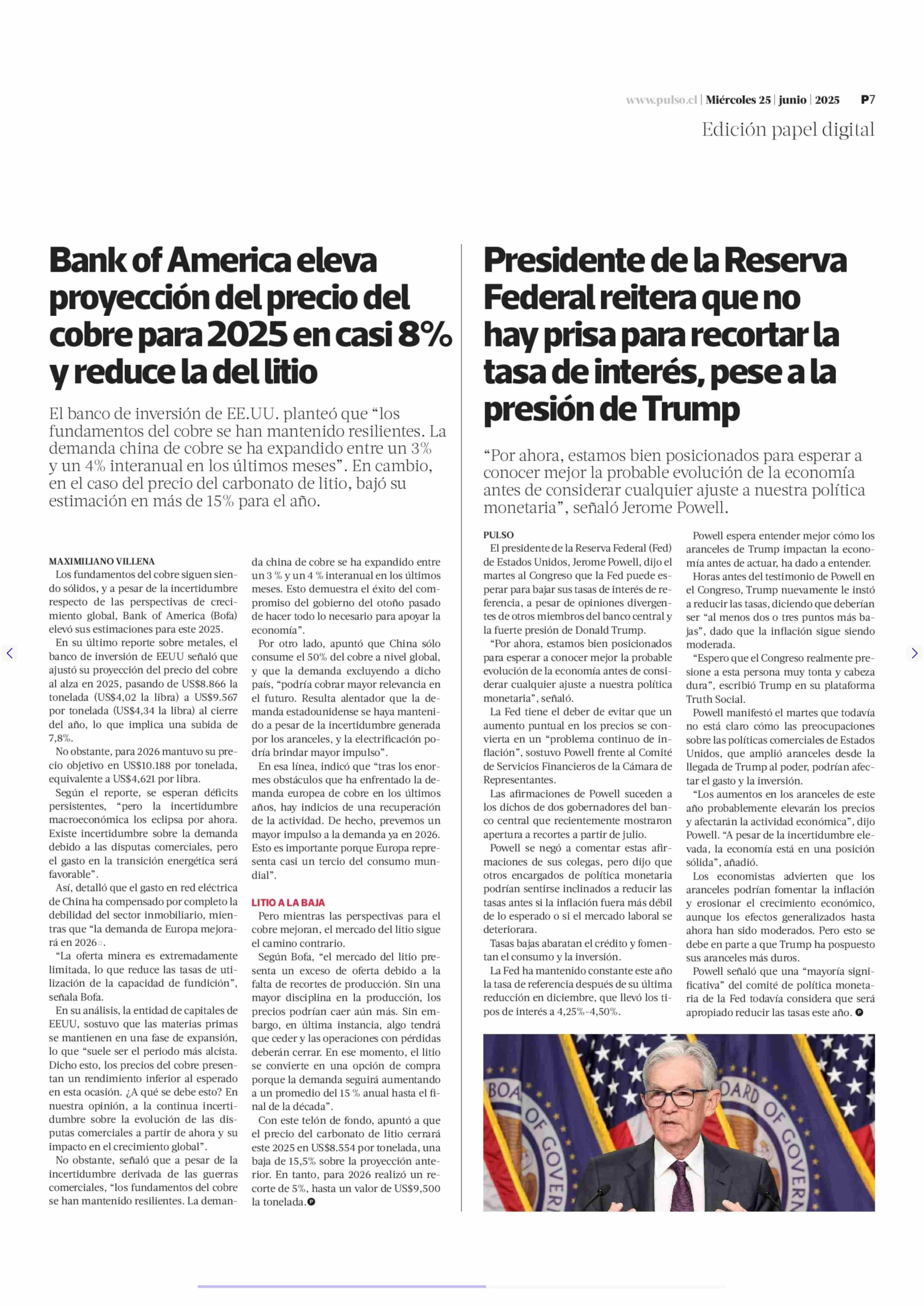 Bank of America eleva proyección del precio del cobre para 2025 en casi 8% y reduce la del litio 25-06-2025 La Tercera |