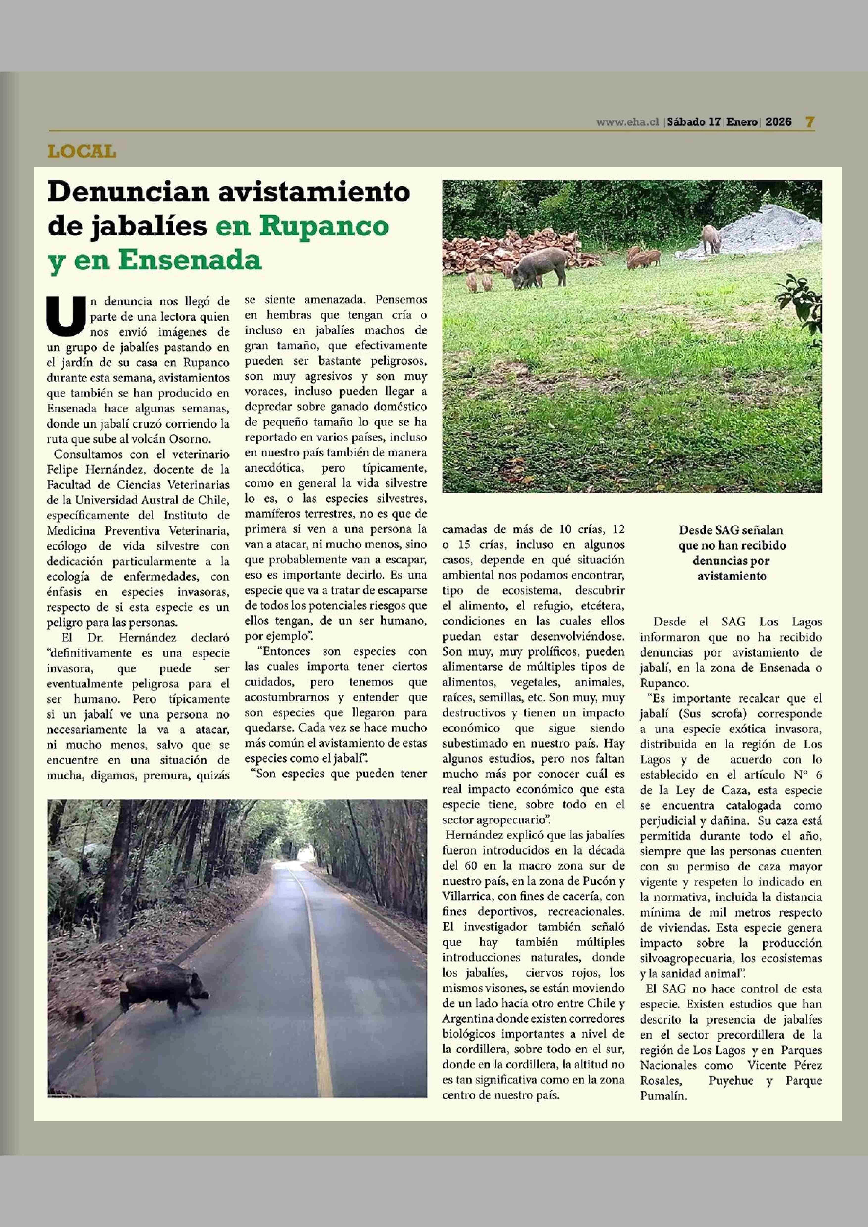 Denuncian avistamiento de jabalíes en Rupanco y en Ensenada 17-01-2026 El Heraldo Austral |