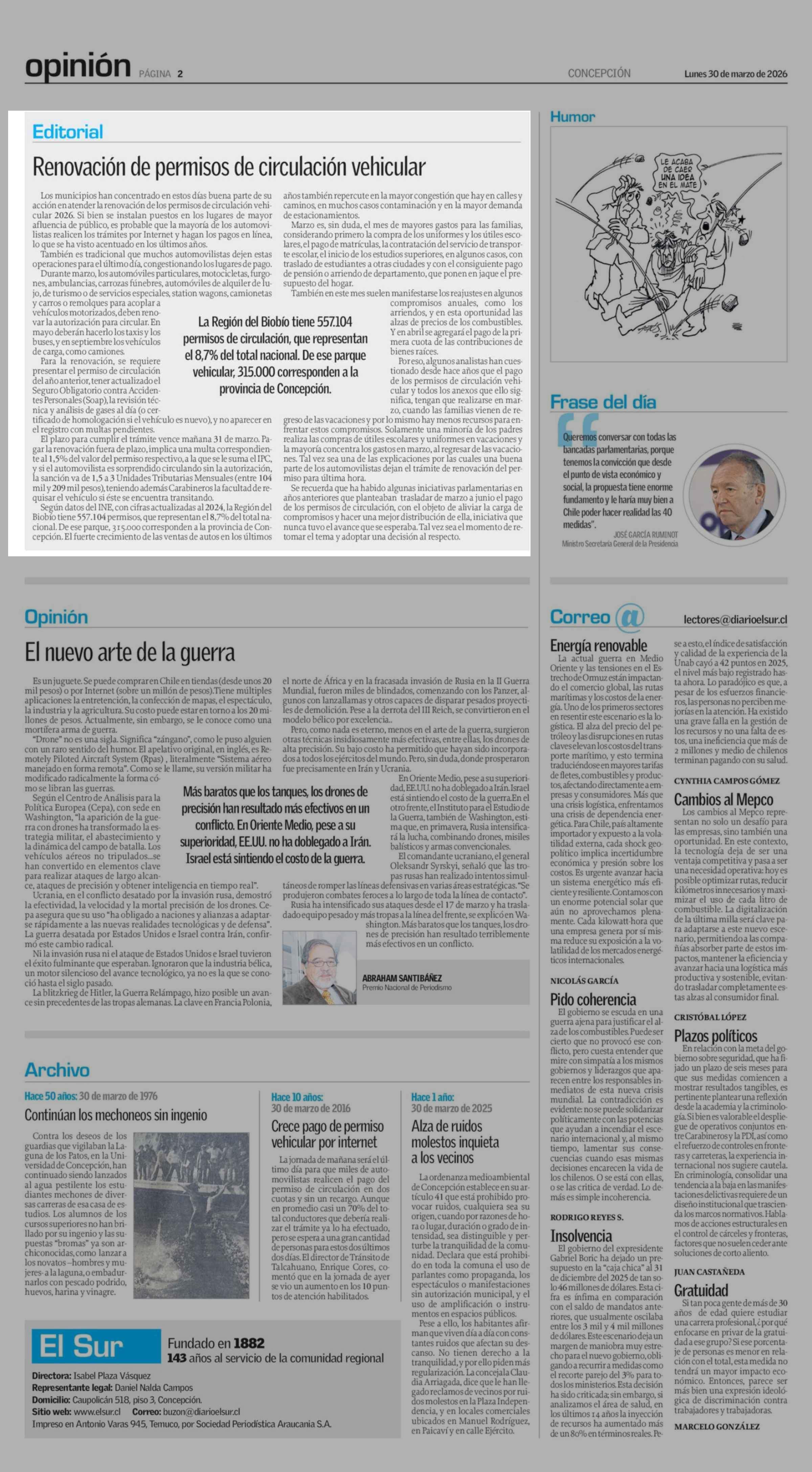 EDITORIAL: Renovación de permisos de circulación vehicular 30-03-2026 El Sur |