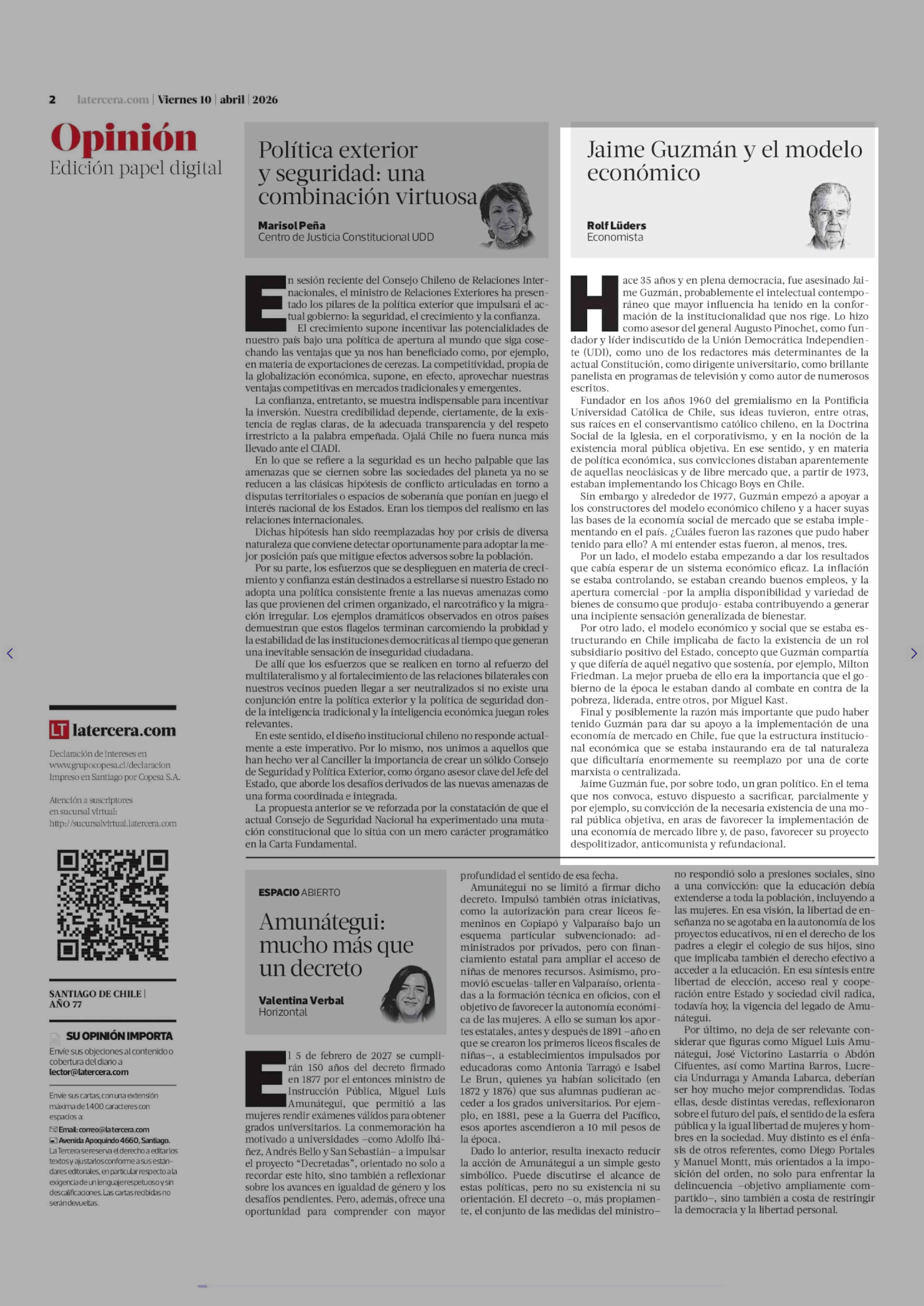 Columnas de Opinión: Jaime Guzmán y el modelo económico 10-04-2026 La Tercera |