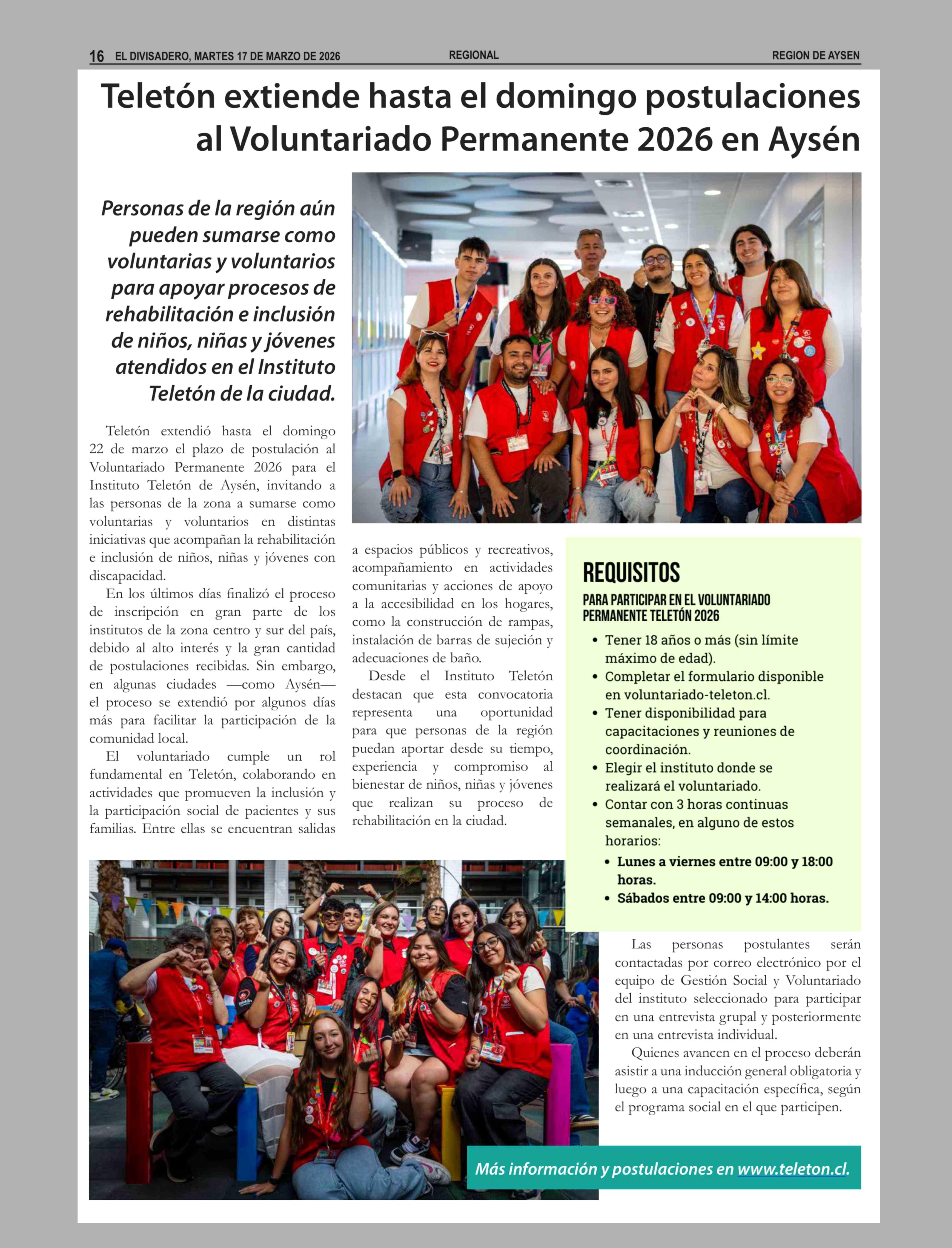 Teletón extiende hasta el domingo postulaciones al Voluntariado Permanente 2026 en Aysén 17-03-2026 El Divisadero |