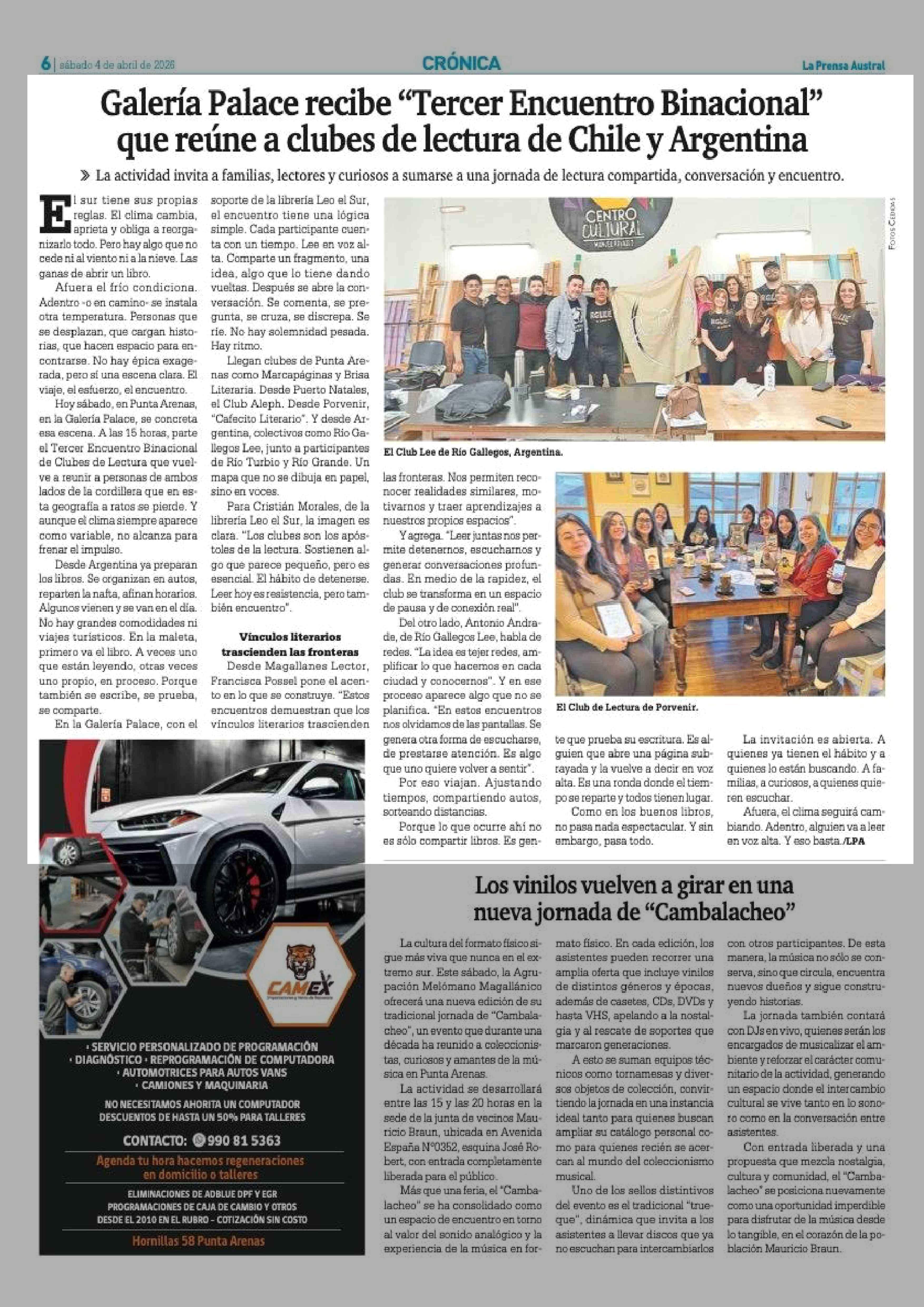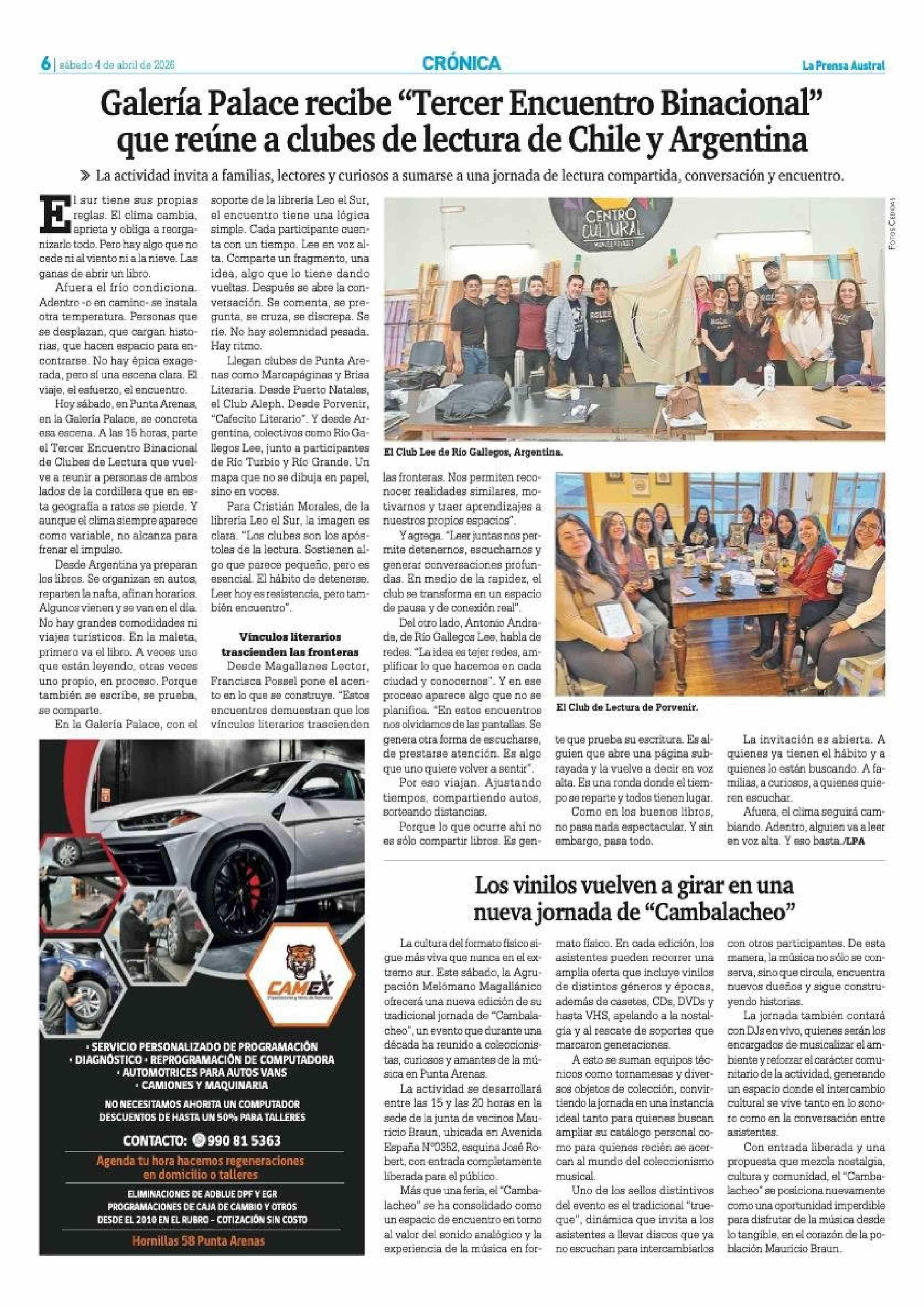 Galería Palace recibe "Tercer Encuentro Binacional" que reúne a clubes de lectura de Chile y Argentina 04-04-2026 La Prensa Austral |