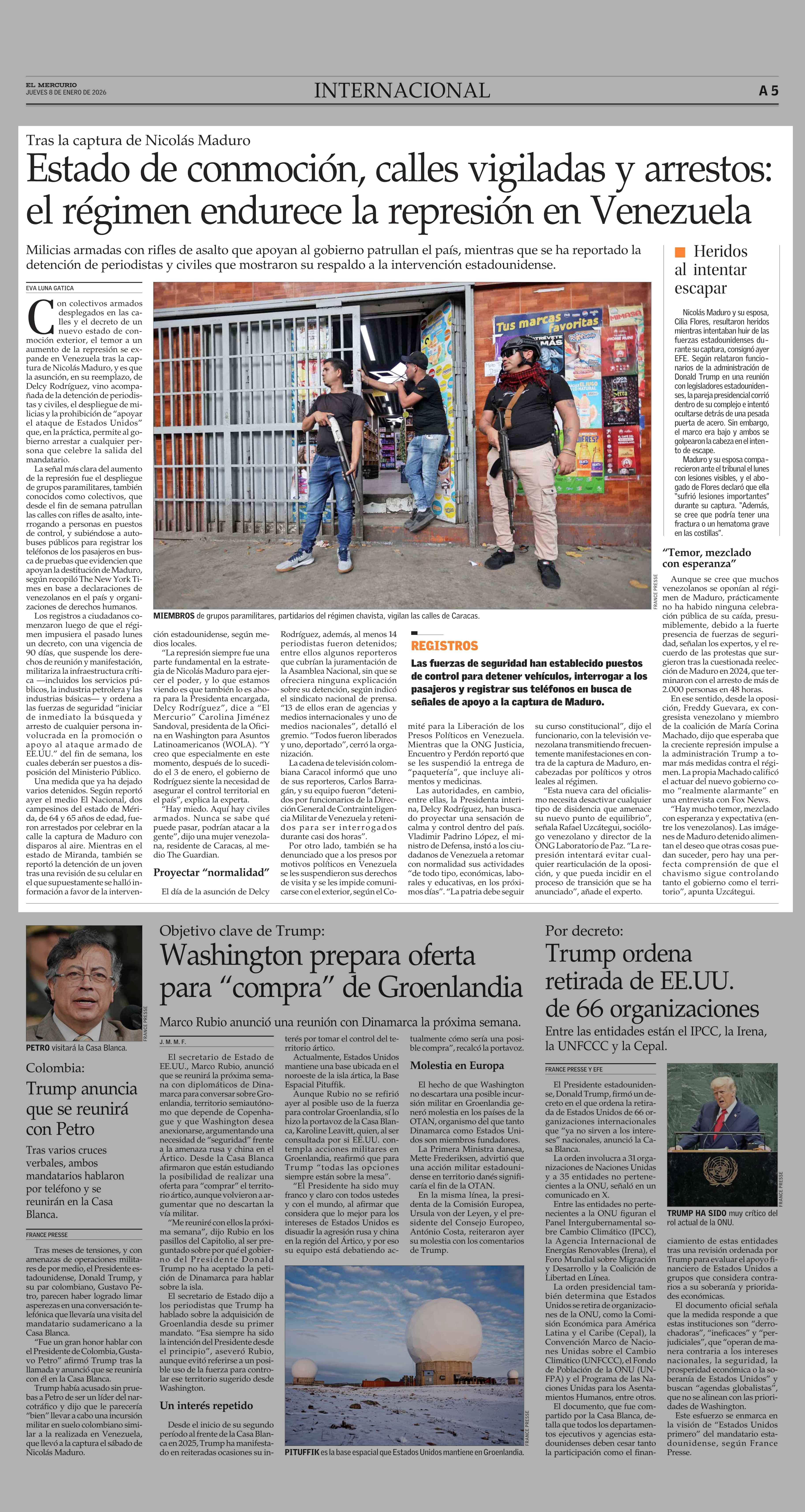 Estado de conmoción, calles vigiladas y arrestos: el régimen endurece la represión en Venezuela 08-01-2026 El Mercurio |