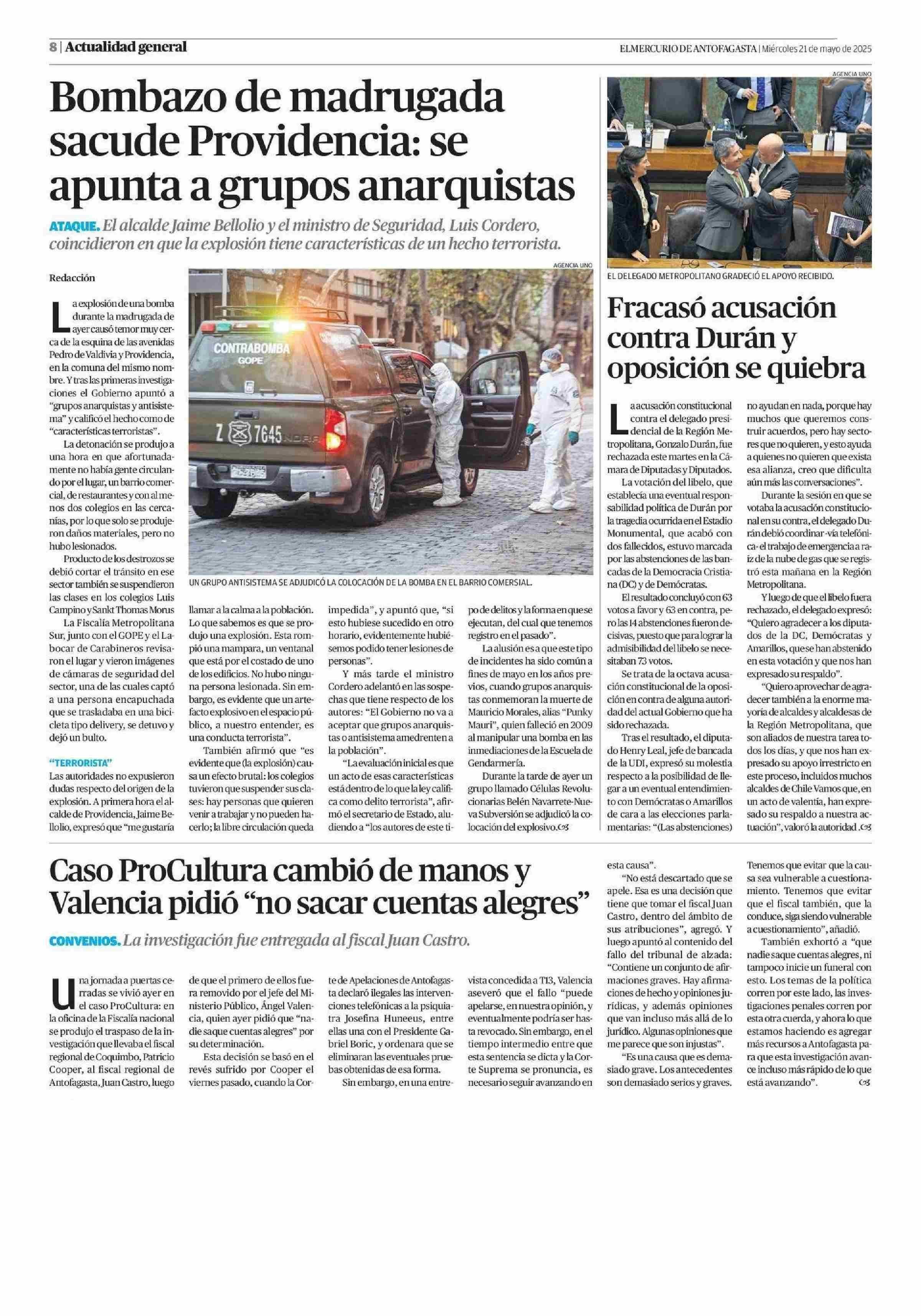 Bombazo de madrugada sacude Providencia: se apunta a grupos anarquistas 21-05-2025 El Mercurio de Antofagasta |