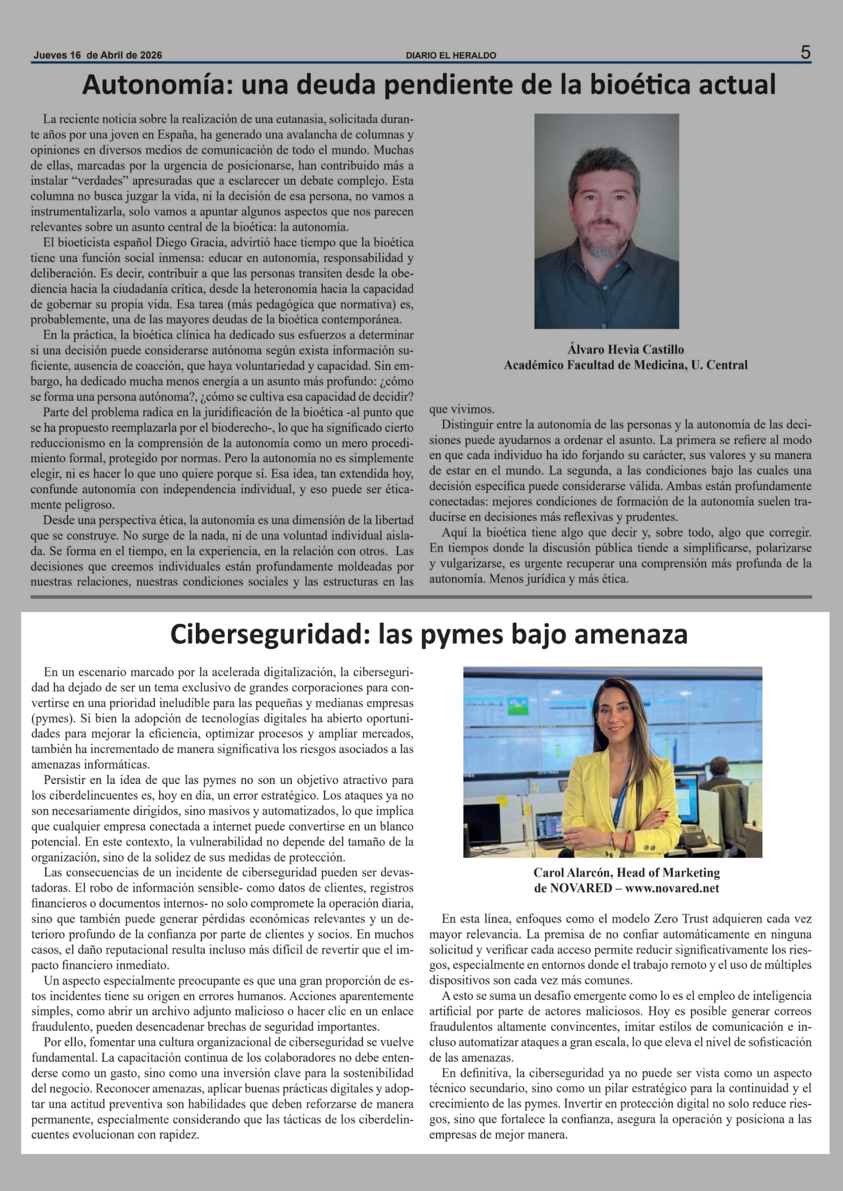 Columnas de Opinión: Ciberseguridad: las pymes bajo amenaza 16-04-2026 El Heraldo |
