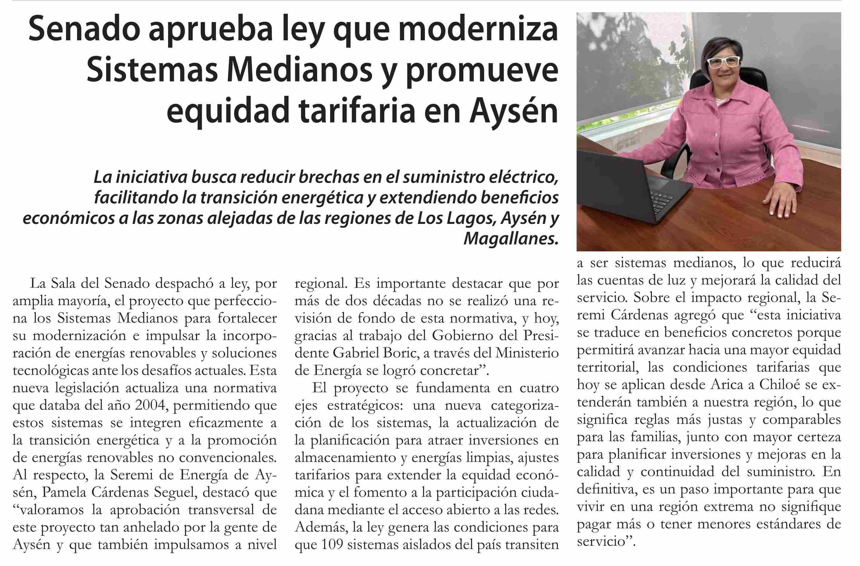| Título: | Senado aprueba ley que moderniza Sistemas Medianos y promueve equidad tarifaria en Aysén |