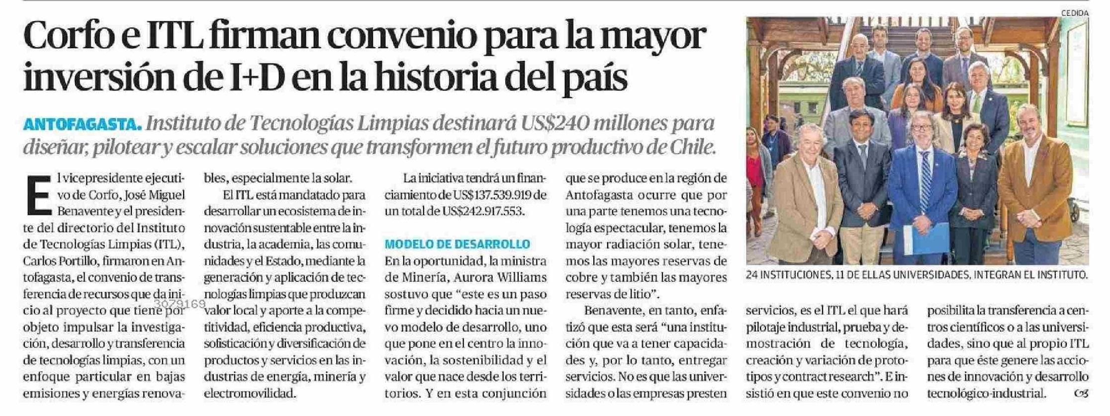 Corfo e ITL firman convenio para la mayor inversión de I+D en la historia del país 25-06-2025 El Mercurio de Antofagasta |