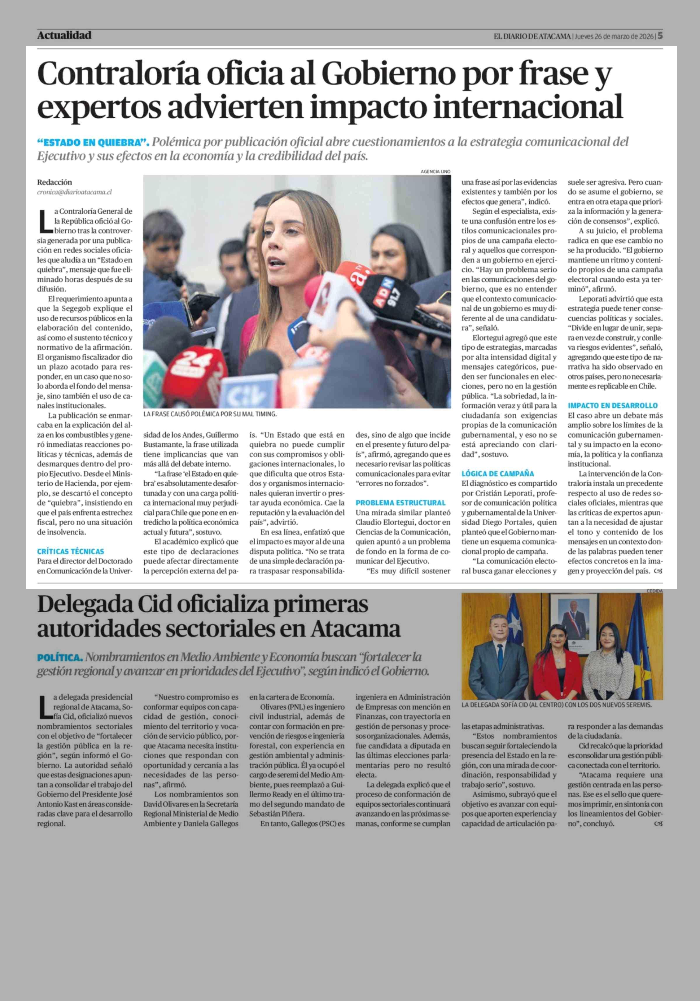 Contraloría oficia al Gobierno por frase y expertos advierten impacto internacional 26-03-2026 El Diario de Atacama |