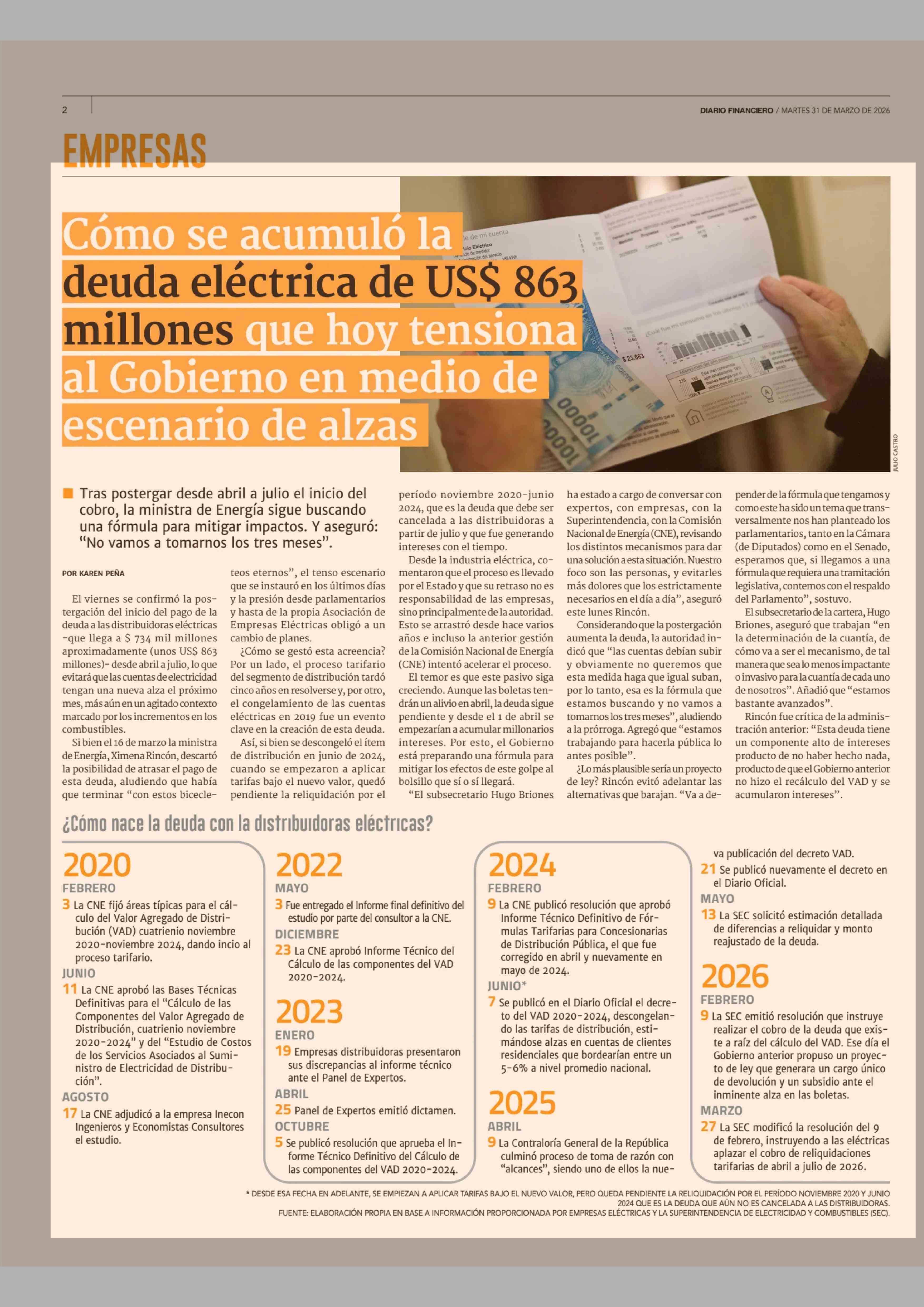 Cómo se acumuló la deuda eléctrica de US$ 863 millones que hoy tensiona al Gobierno en medio de escenario de alzas 3000L 0000L 31-03-2026 Diario Financiero |