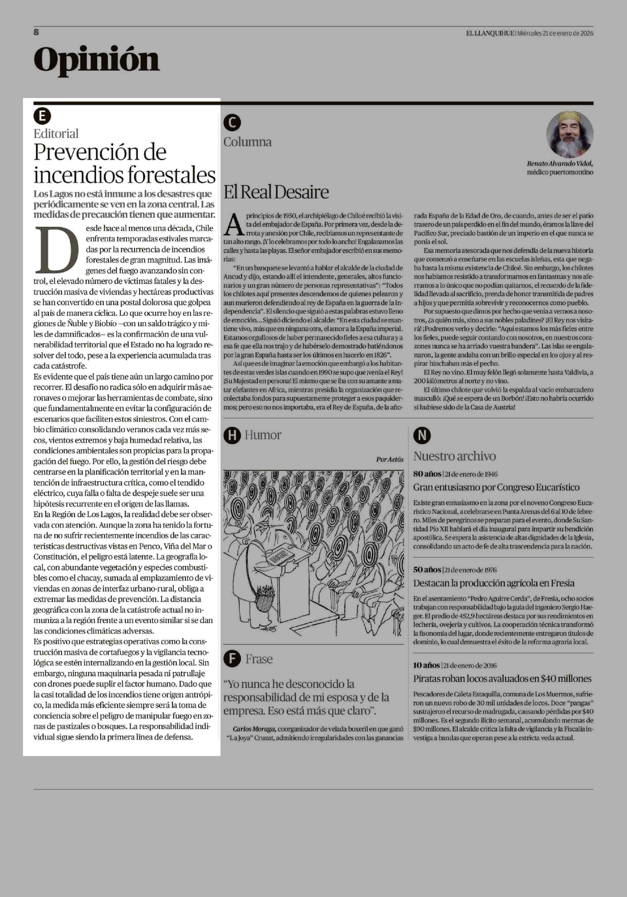 Editorial: Prevención de incendios forestales 21-01-2026 El Llanquihue |