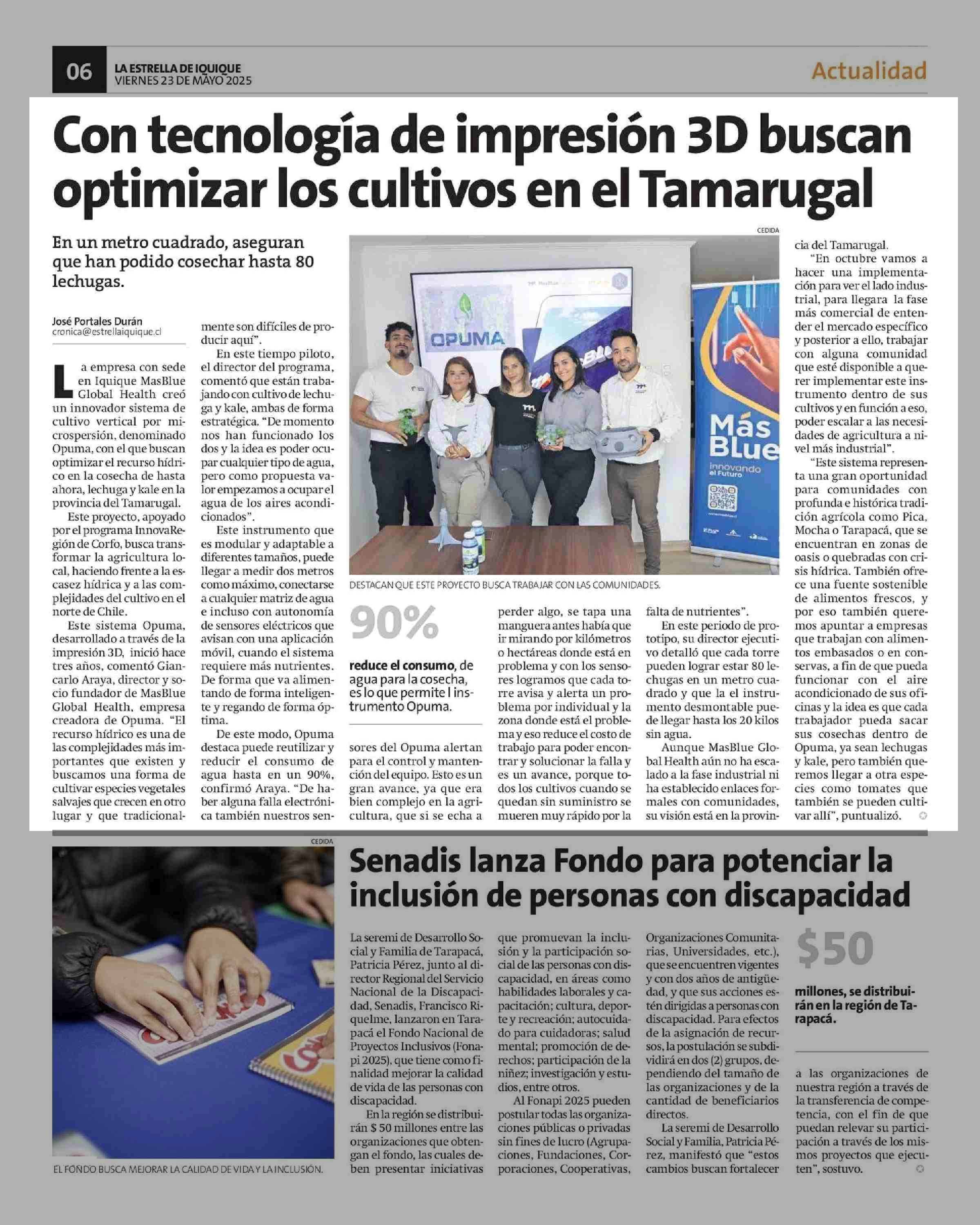 Con tecnología de impresión 3D buscan optimizar los cultivos en el Tamarugal 23-05-2025 La Estrella de Iquique |